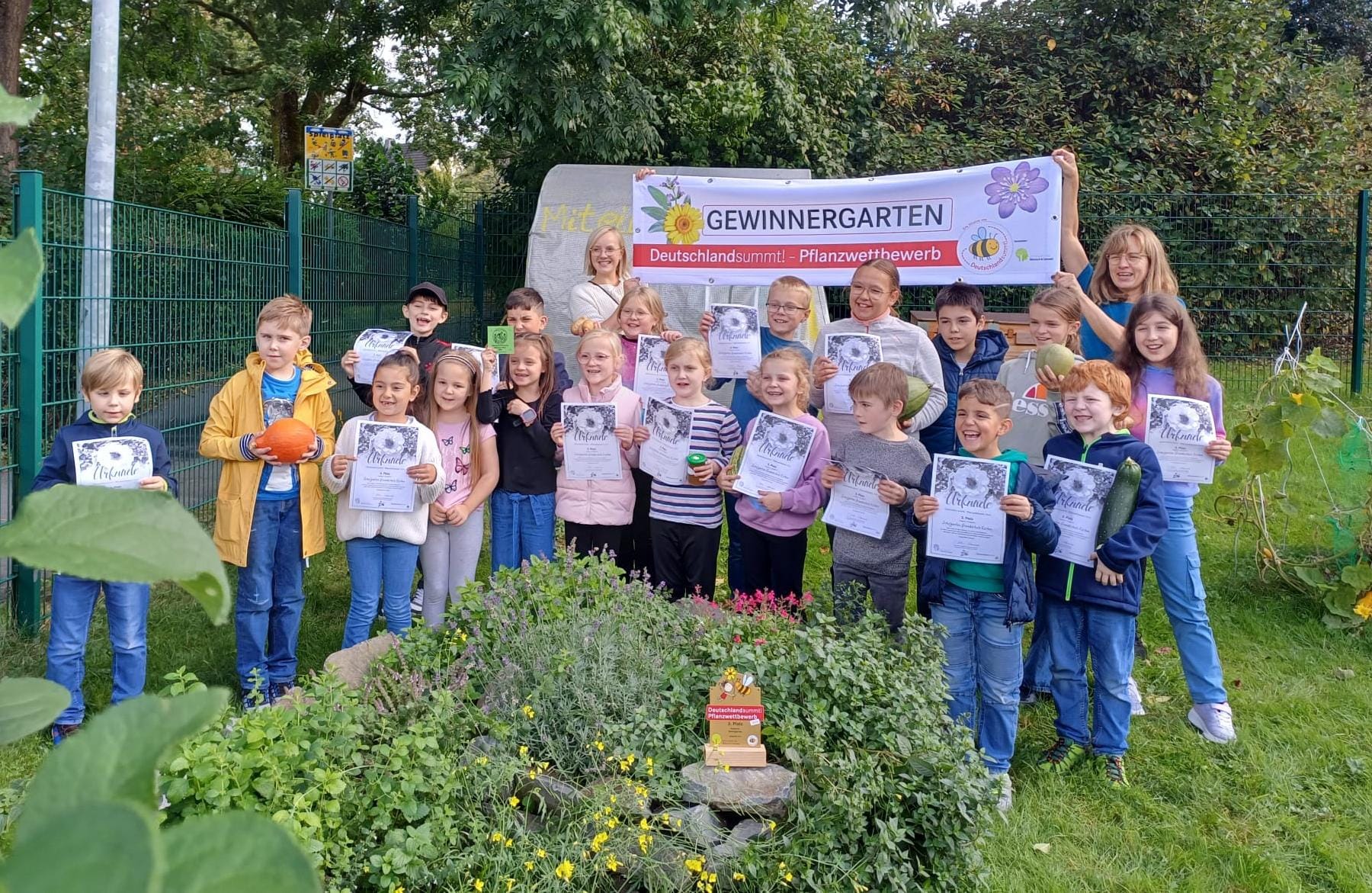 Nachdem wir letztes Jahr schon bei Deutschland summt mitgemacht haben, hat unsere Schulgarten Kids die Euphorie und der Ehrgeiz gepackt. Als ich uns damals für den Wettbewerb angemeldet hatte, habe ich mir nicht ausmalen können, was dieser Wettbewerb bei uns auslöst und was er alles verändert. Wir sind eine Grundschule mit 135 Kindern aus vielen verschiedenen Nationen. Von den 135 Kindern nehmen 80 Kinder an der Schulgarten AG teil.