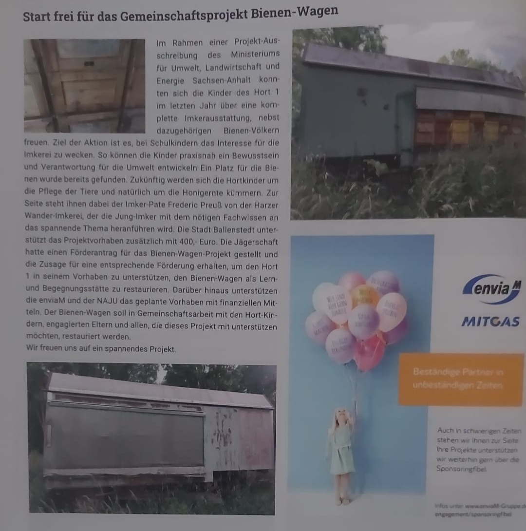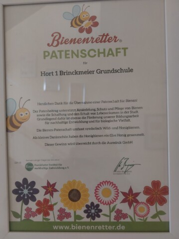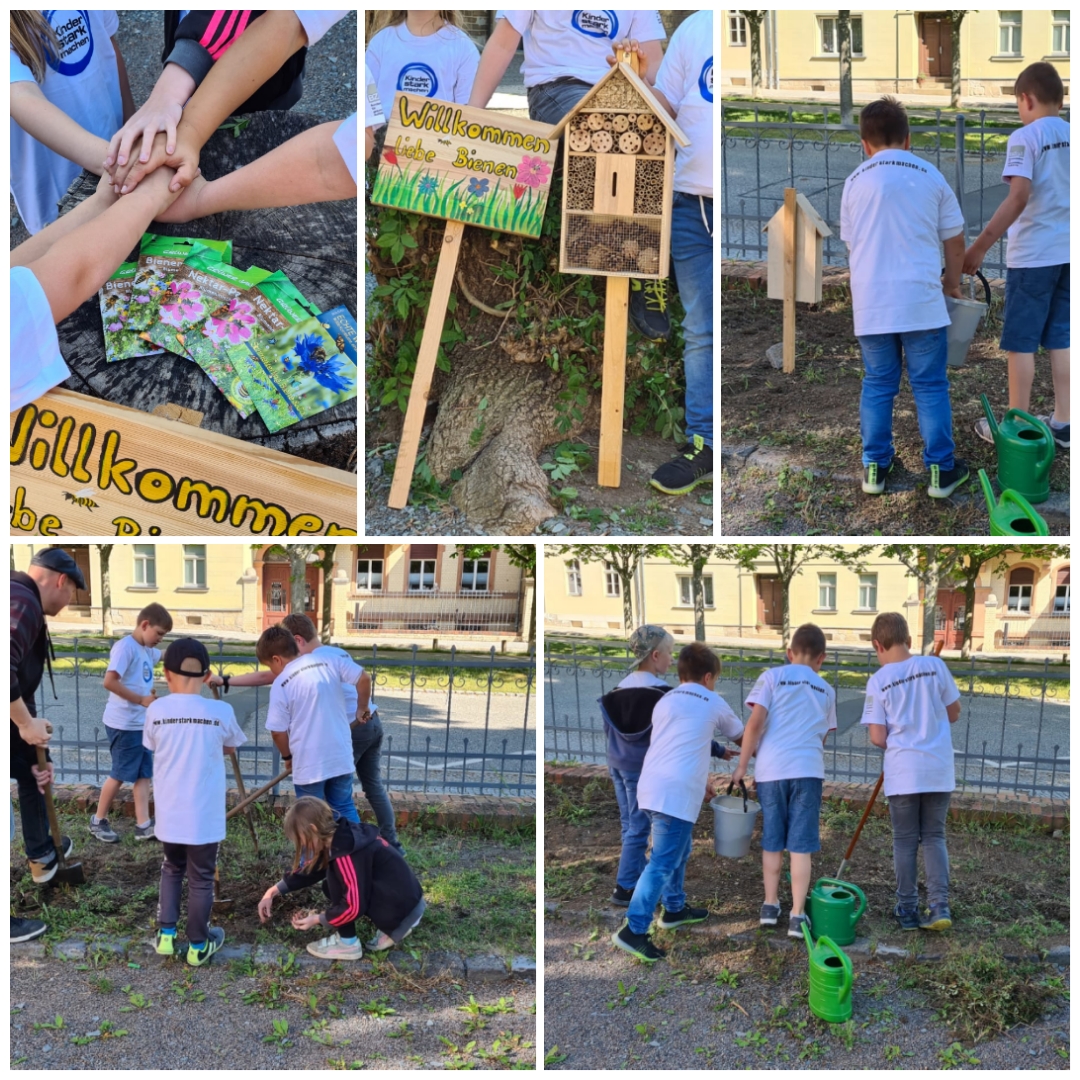 Wir als Horteinrichtung haben eine Schulimkerei und bauen derzeit einen alten Bienen Wagen zu einem außerschulischen Lernort und einer Begegnungsstätte um. Wir beteiligen uns an verschiedenen Pflanzaktionen, bewirtschaften mit den Kindern einen kleinen Garten und behandeln in verschiedensten Projekten gemeinsam mit den Kindern Themen rund um das Thema Bienen, Insekten, Umwelt- und Naturschutz und wie man selbst, auch im Kleinen, dazu beitragen kann, die Natur zu schützen.