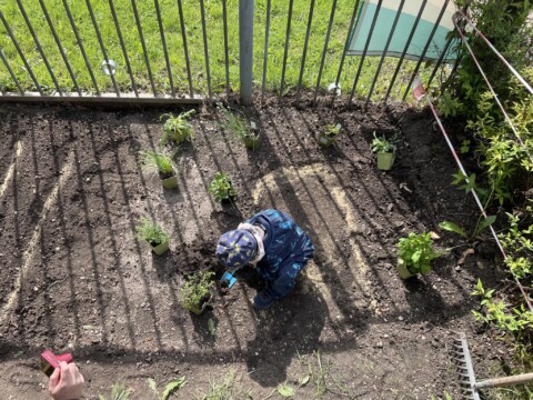 Nun ist seit ein paar Tagen das Schild angebracht und die Kinder lunzen immer wieder über den Zaun auf unseren Mini-Garten. Endlich ein kleines bisschen Blattwerk, ein bisschen Grün, ein wenig Hoffnung. Und ein Dankeschön an die gespendeten Tomatenpflanzen der Eltern.