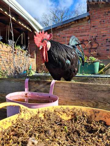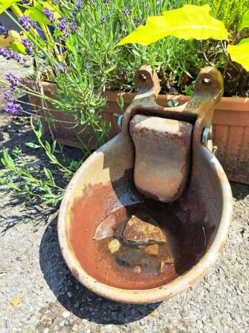 Hier können sich Insekten und Igel bedienen. Eine alte Kuhtränke wurde mit kleinen Kieselsteinen zur Insektentränke umfunktioniert.