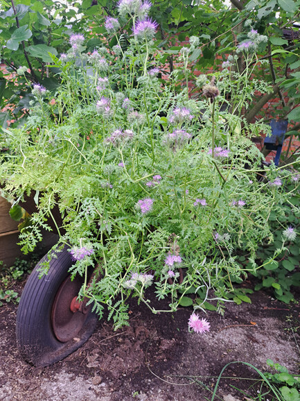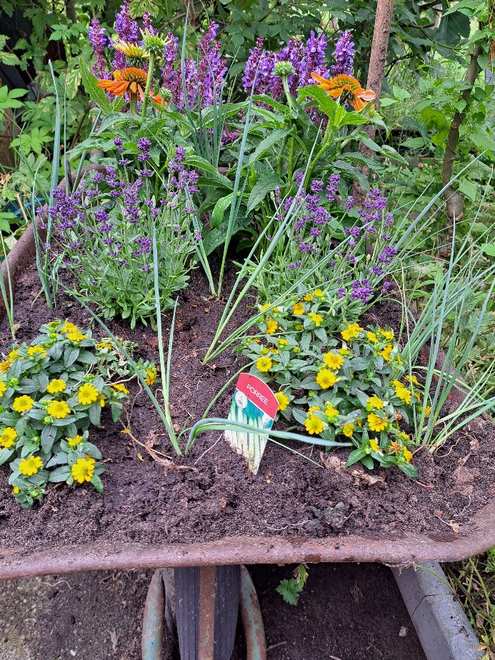 Alte Schubkarren wurden mit Bienen und Schmetterlingsfreundlichen Pflanzen bepflanz wie z.B. Salbei, Lavendel oder Sonnenhut. Wir haben auch einige Porre Pflanzen dazwischen gesetzt. Was nicht gegessen wird darf blühen.