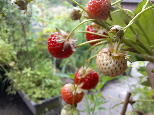 Die Erdbeeren blühen von Anfang Mai bis in den Juli hinein und wachsen zwischen Blumen und Kräutern besonders gut. Als Schutz vor gefräßigen Nacktschnecken haben wir sie erhöht in alten Blumenkästen gepflanzt.