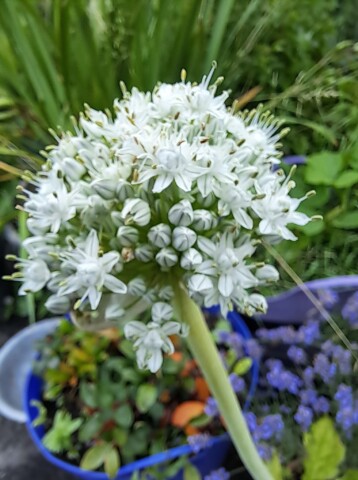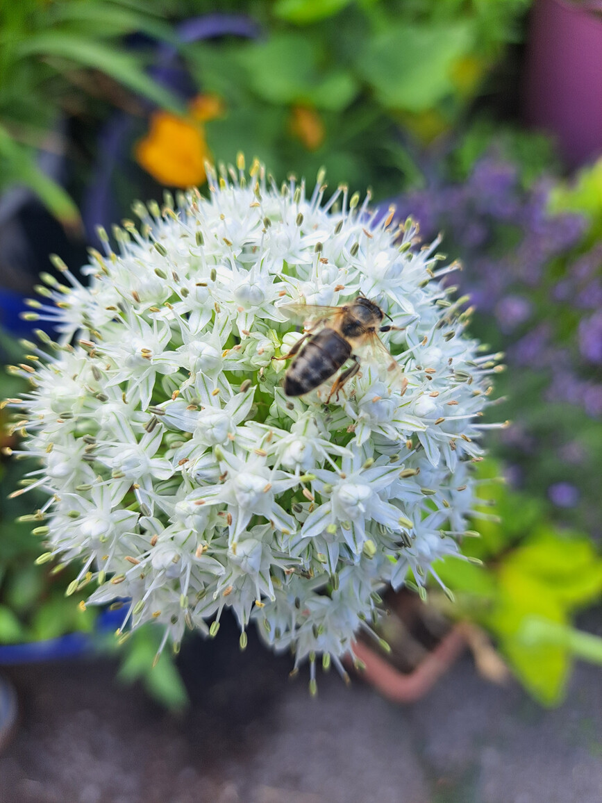 Zwiebelknollen oder etwas unansehnlich gewordene Porreestangen bekommen eine 2. Chance. Meistens wachsen sie gut an und erfreuen uns mit einer großen runden Blühte.