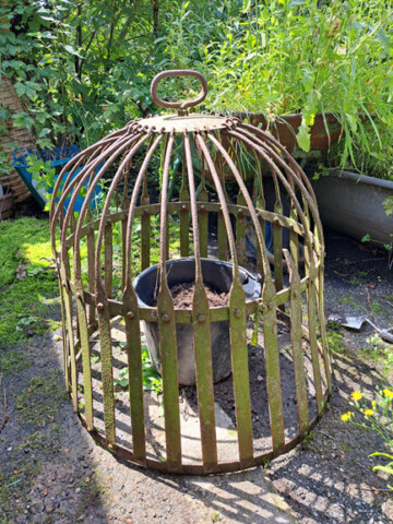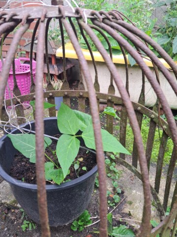 Schmuckbohne brauchen etwas zu hochranken. Wieso nicht den alten Feuerkorb dafür nehmen? Mal sehen ob es funktioniert. Die Bohne habe ich in einen Eimer mit Erde gesät. Nun heiß es abwarten.