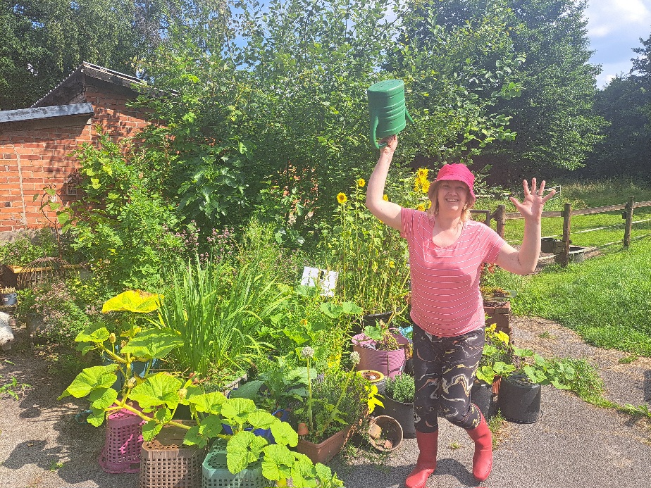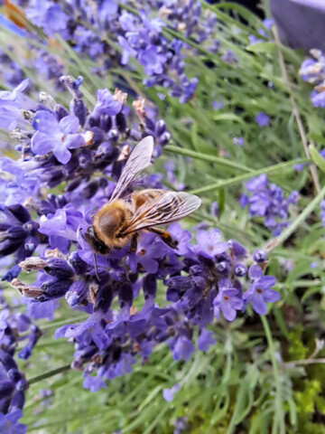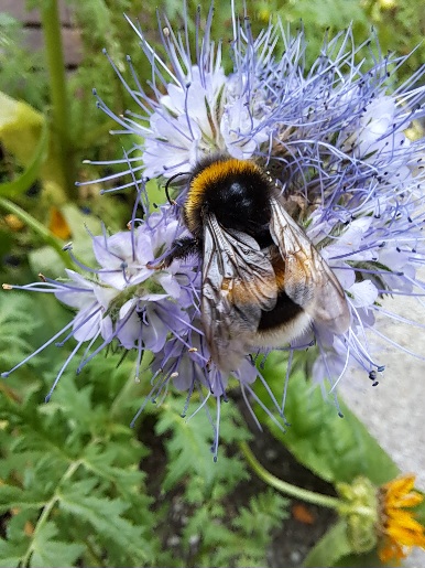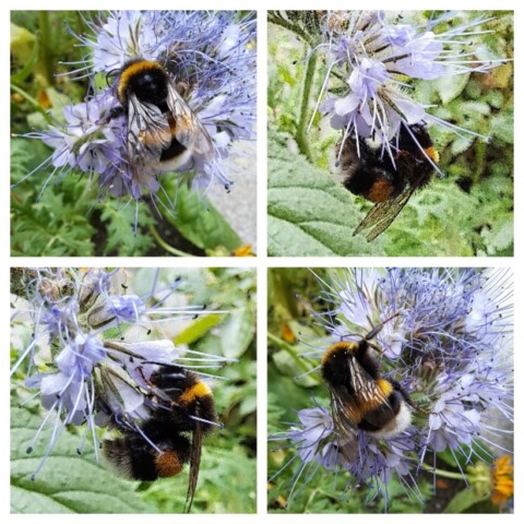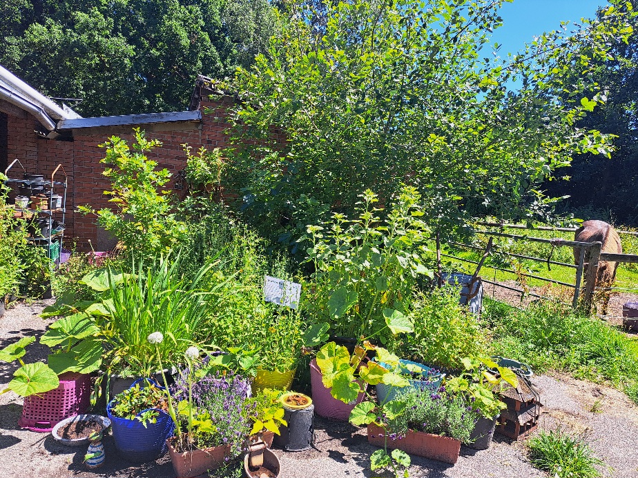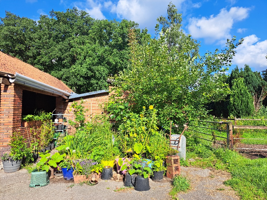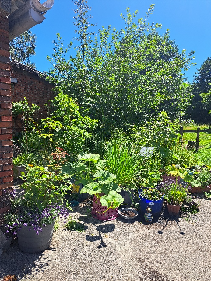 Eine große Asphaltfläche wurde durch anpflanzen von Wildblumen, Sonnenblumen, Lavendel, Oregano, Apfel, Feigen und Kiwibäumen sowie Holunder und Weiden ein Paradies für Bienen, Hummeln und vielen Käfern und Fliegen. Alte Schubkarren, Badewannen und Eimer dienen mit alten Holzkisten als Beete. Erdbeeren, Chilipflanzen, Kürbisse und Tomaten werden von den Bienen bestäubt und wir erfreuen uns an der reichen Ernte. Insektenhotels dienen als Überwinterungshilfen. In einigen Beeten pflanzen wir alte Zwiebeln die dann anfangen zu blühen oder weggeworfene Grab Bepflanzung bekommt hier eine 2. Chance zu wachsen und zu blühen. Es gibt Insektentränken und bis in den späten Herbst hinein immer eine Pflanze die blüht.