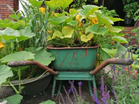 Wir lieben Recycling. Alte Schubkarren dienen unseren Nutzpflanzen als Beete. So erhöht kommen die Schnecken nicht so schnell an die Jungen Pflanzen.