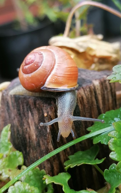 Der dunkle und feuchte Boden ist das Reich der Schnecken. Die großen Blätter der Kürbisse bieten reichlich Schatten.