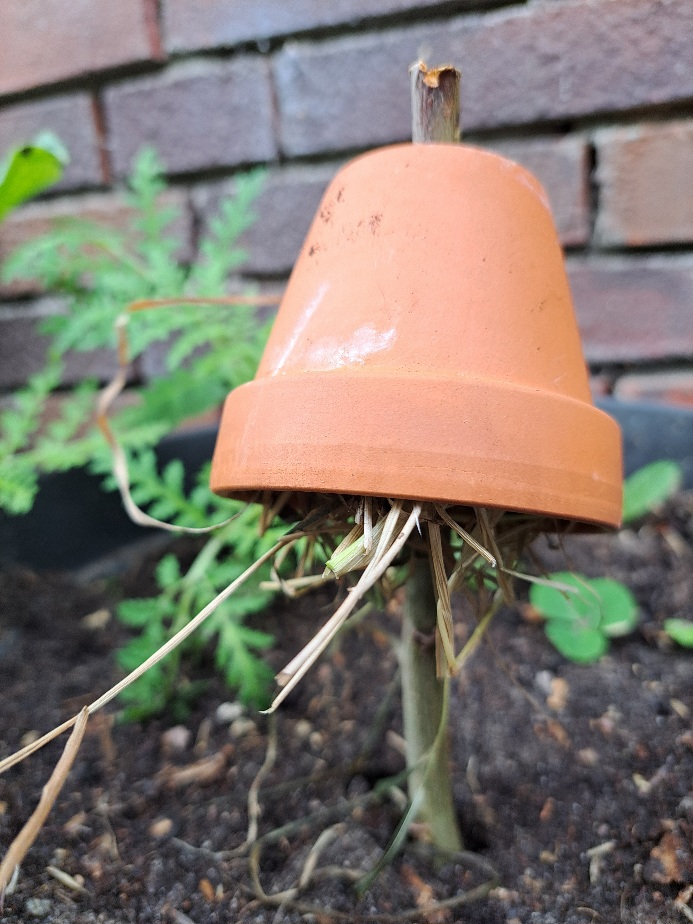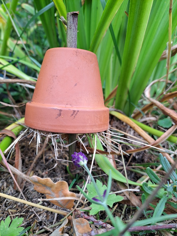 Ohrenkneifer Hotel: An einem kleinen Stock mitten im Beet steckt ein kleiner Blumentopf aus Ton. Gefüllt mit Heu und Stroh ist es das Ideale Hotel für Ohrenkneifer.
