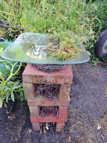 Aus alten Ziegelsteinen, Holz, Reisig und einer alten Glasschale haben wir ein Insektenhotel mit Tränke für Vögel und Bienen gebaut.