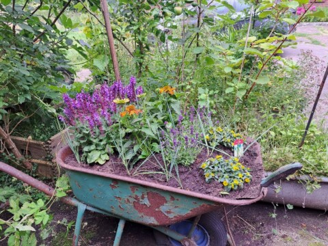 Ausgediente Schubkarren werden zu blühende Beete