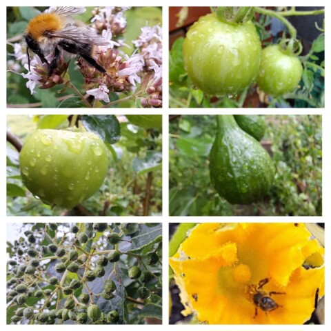 Hier ein kleiner Ausschnitt. Natürlich brauchen die Tomaten noch etwas Sonnenschein und die Kürbisse den Regen. Auch müssen die Äpfel, die Feigen und der Holunder sich noch etwas geldulden.