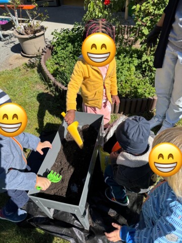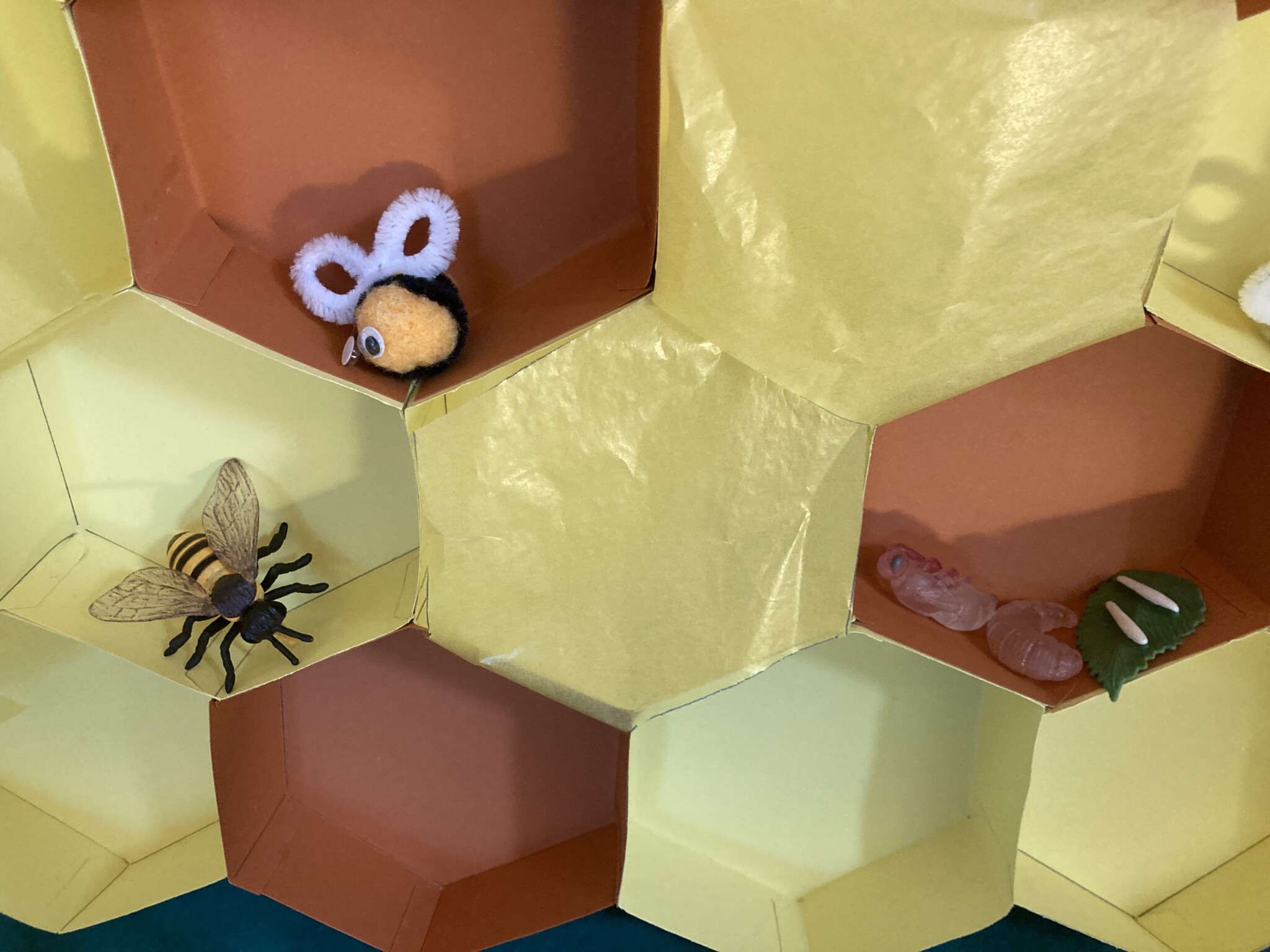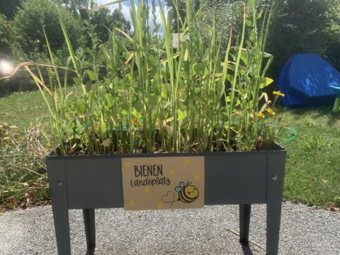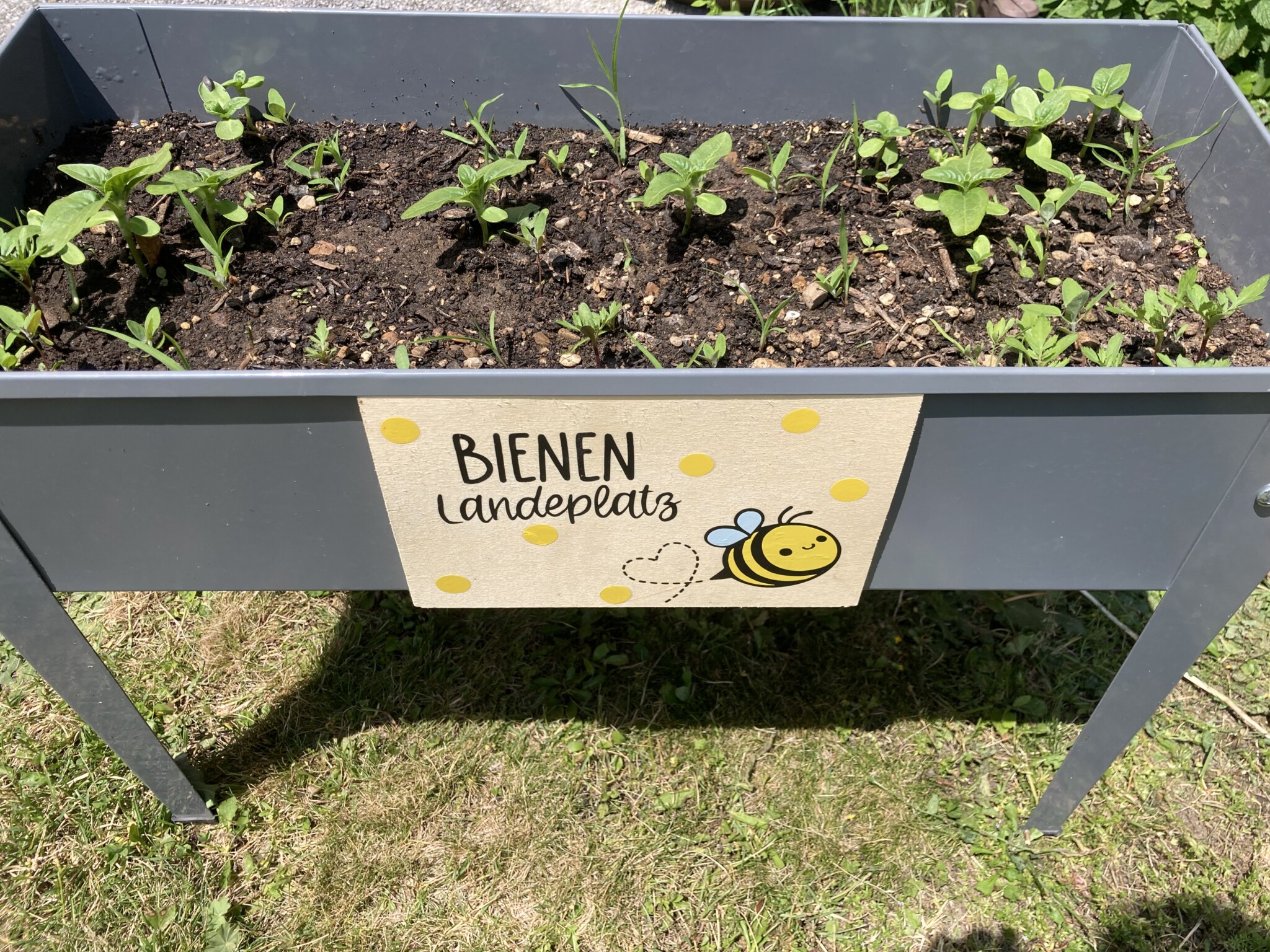 Wir, die Mäusegruppe (U3) haben im späten Frühjahr ein Bienenprojekt gestartet und die Kinder waren voller Begeisterung dabei. Wir haben neben Sachgesprächen über die Bienen, Plakate erstellt, gesungen, Bewegungsspiele gemacht, mit allen Sinnen gelernt (Honig probiert, Blumen/Honig gerochen, Bienenmodelle genau untersucht, die Sicht durch ein Facettenauge erlebt,…), den Imker besucht und ein Blumenbeet angelegt, da in der Kita der Rasen immer gemäht werden muss.