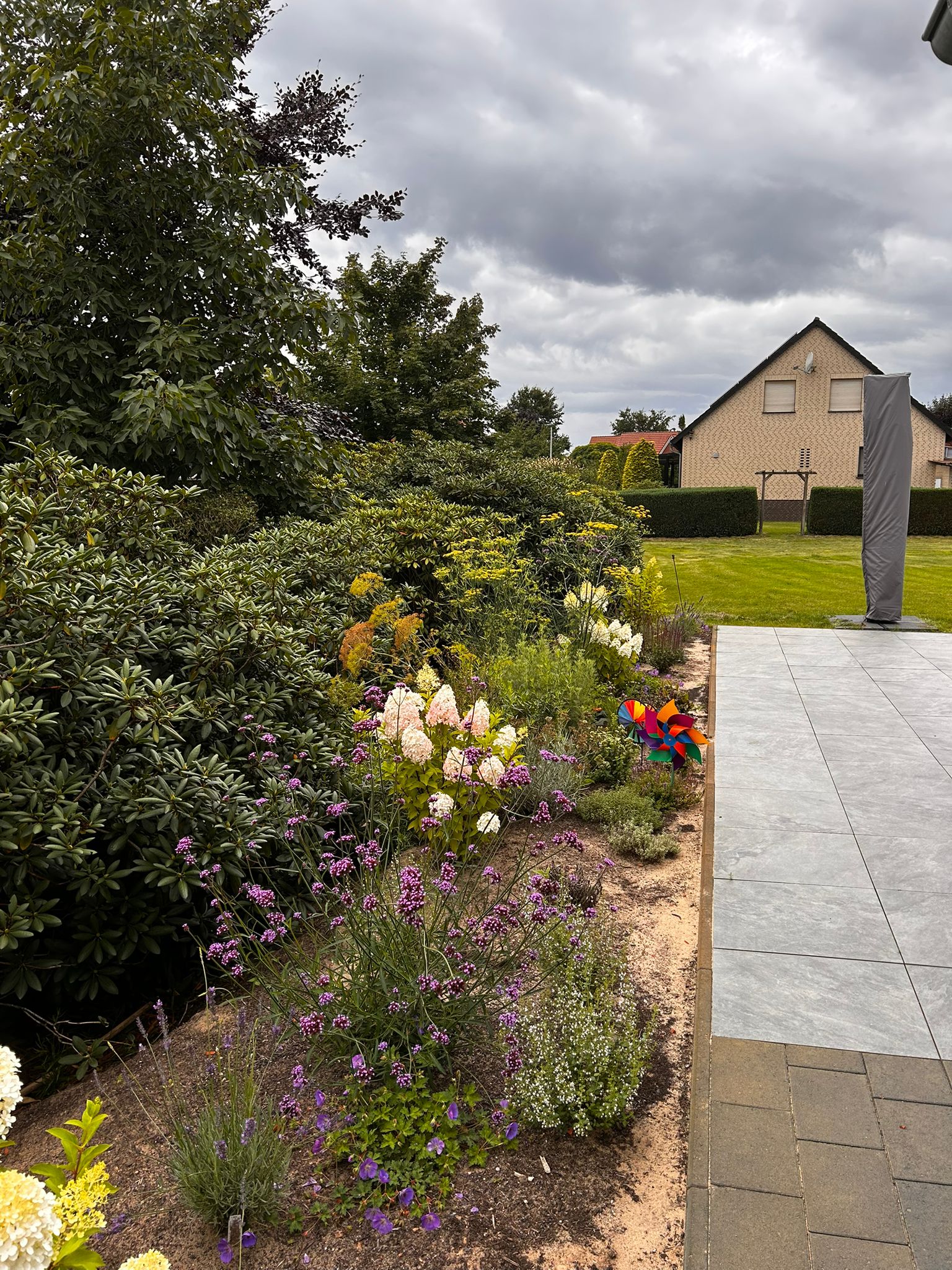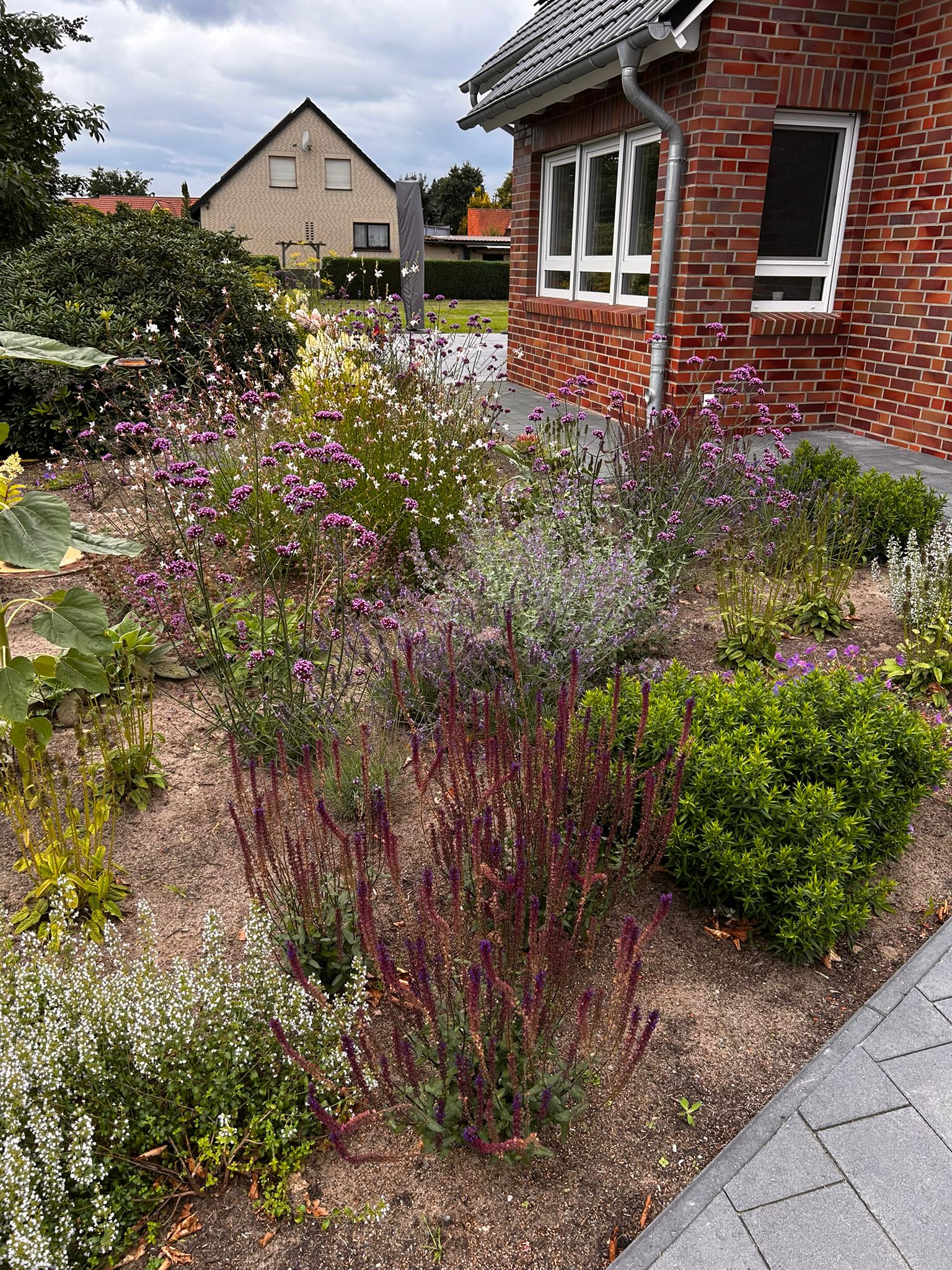 Das Vorbeet geht über Eck, so dass noch eine kleine Kräuterecke in dem Beet ihren Platz gefunden hat.