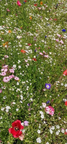 (z.B. Buschwinden, Goldmohn, roter und blauer Lein, Schleierkraut, Klatschmohn, Kornblumen, Ringelblumen, Schmuckkörbchen, Kapmargeriten, Schleifenblume, Färbermädchenauge, Sonnenflügel, Meerviole, halbhohe Sonnenblumen…)