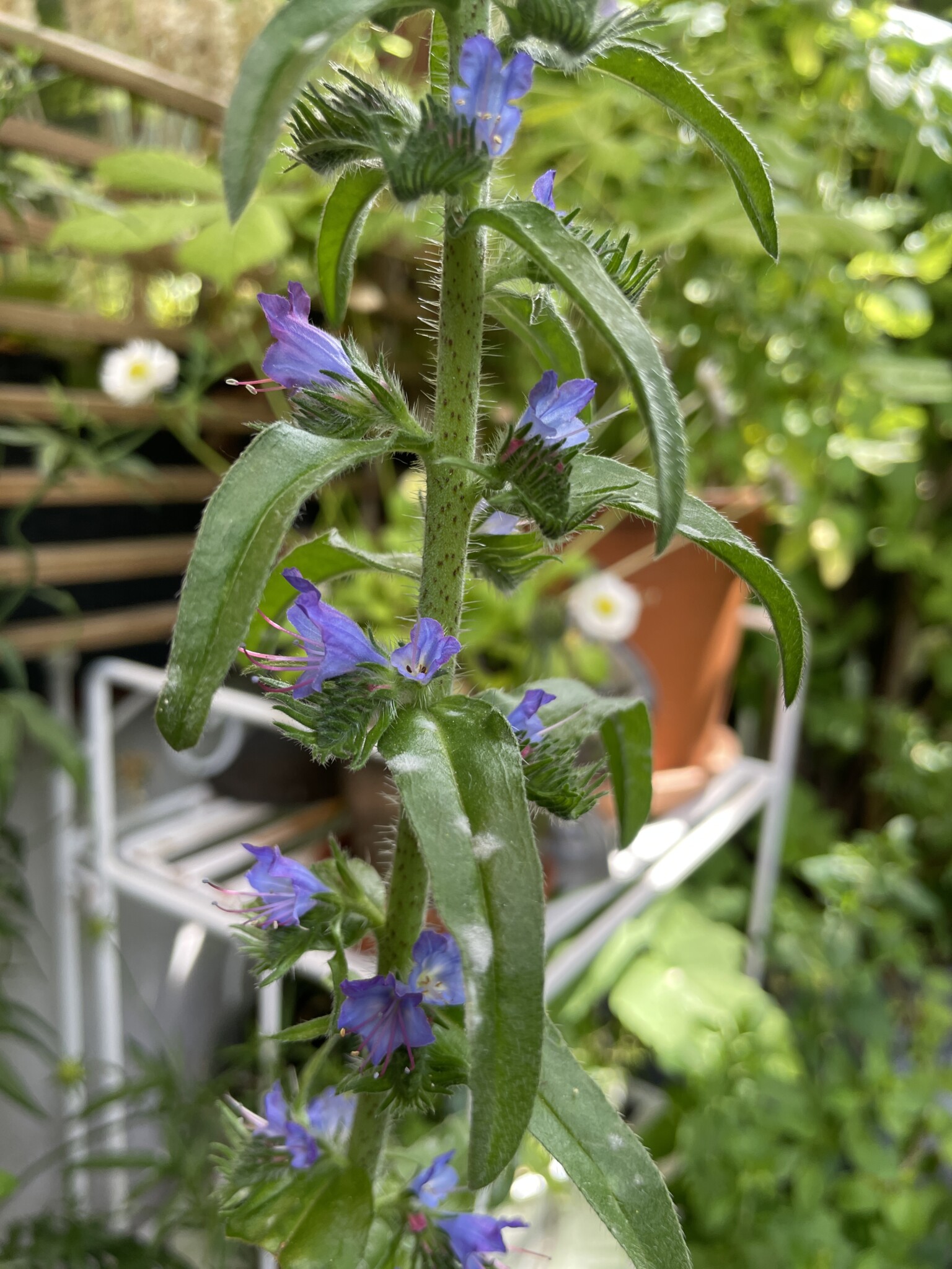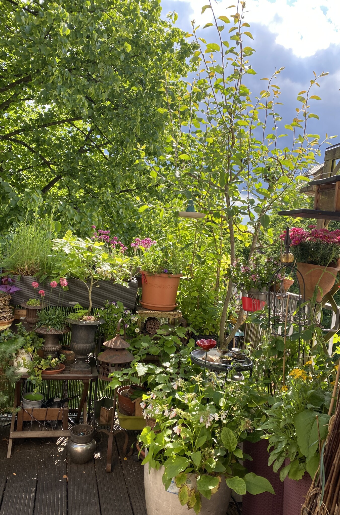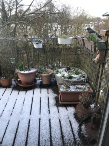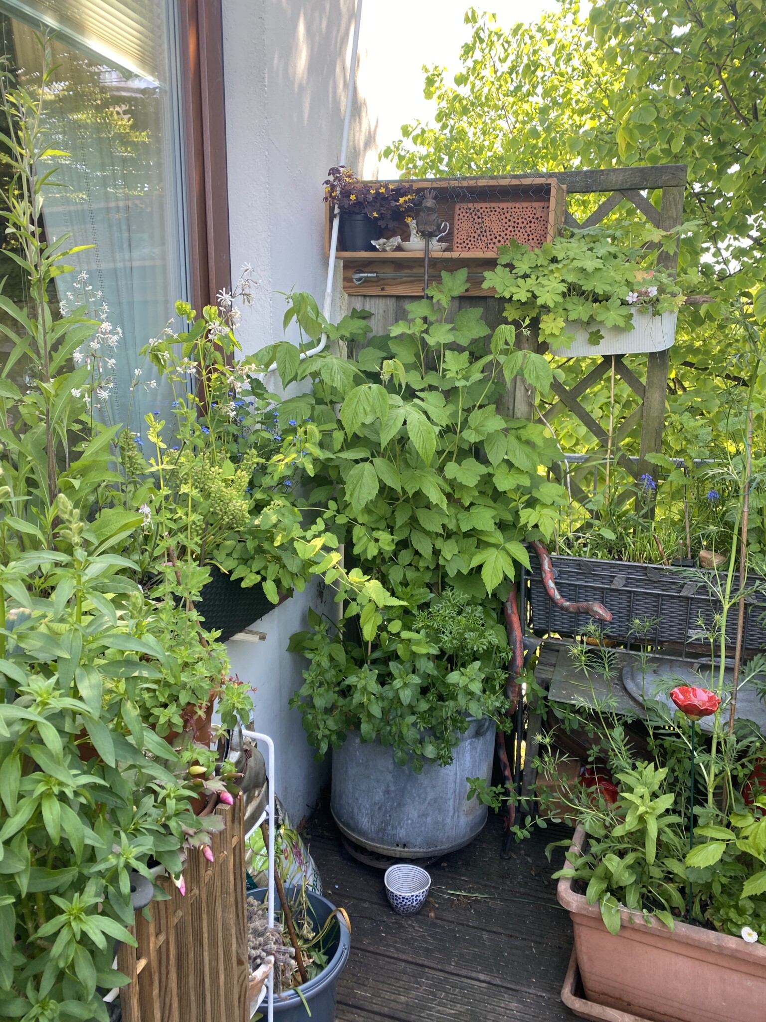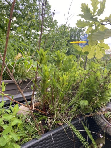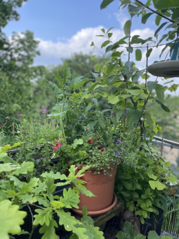 Dann kamen die ersten neuen Pflanzen in die Erde und in diesem Frühjahr fangen sie an zu wachsen, groß zu werden – zum Teil sehr groß! – und Blüten zu entwickeln. Einige Pflanzen werden mir als Geschenke von meinen gefiederten Besuchern vorbeigebracht und die Eichhörnchen pflanzen unermüdlich Bäume in meine Kästen und Töpfe. Sie sind also an meinem Balkonprojekt maßgeblich beteiligt – vermutlich haben sie mehr Ahnung von dem, was sie tun, als ich.