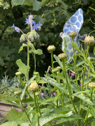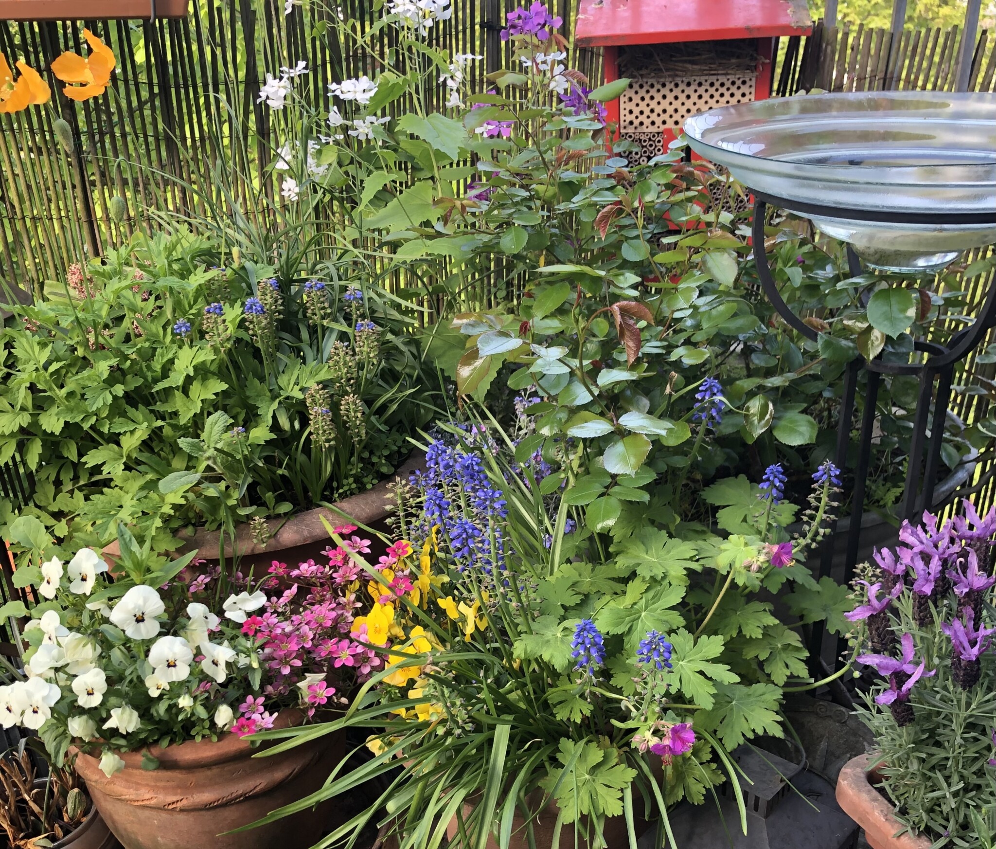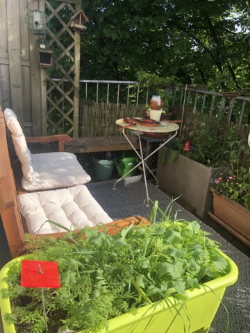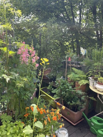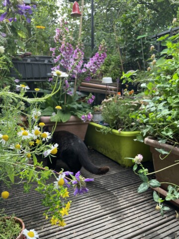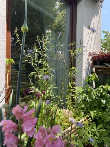 Nun ist Anfang Juli. Die meisten Pflanzen haben sich gut entwickelt und bieten einer Vielzahl an Insekten Nahrungsangebot. Gleichwohl stelle ich fest, dass es zwar überall krabbelt und fliegt, ich jedoch z.B. die Hornisse noch nicht gesichtet habe, die im letzten Jahr täglich zum Trinken kam. Auch sind nicht alle Röhren der Wildbienen-Nisthilfen besetzt. Auch von den gefiederten Besuchern haben sich einige seit geraumer Zeit nicht mehr blicken lassen: der kleine Zaunkönig, der Zeisig und auch der Grünfink. Für mich ein Zeichen dafür, dass es den Tieren in der Stadt – aus unterschiedlichsten Gründen – zunehmend schlecht geht. Ein Grund mehr, unaufhörlich darüber zu reden und sich über jedes neue Projekt zu freuen, das sich für den Erhalt einsetzt. Es wissen immer noch zu wenig Menschen, wie wenig es braucht, um anzufangen und etwas dafür beizusteuern, dass der Natur um uns herum hilft. Wie „Moin Stadtnatur“, ein Projekt der Loki-Schmidt-Stiftung in Hamburg, die kostenfrei und niederschwellig berät. Ich würde mir wünschen, dass z.B. Blumenketten wie „Blume2000“ Kooperationen mit Gärtnereien für heimische Pflanzen vereinbaren würden, dass es auf Wochenmärkten eigene Infostände gäbe, die aufklären, vermitteln und Anreize schaffen, dass es in KiTas und Schulen Workshops gibt, die das Bewusstsein für die Notwendigkeit von aktivem Naturschutz schulen. Es gibt noch immer viel zu viele versiegelte Flächen und Aktionen wie „Tegelwippen“, das Abpflastern wo Flächen gemeldet und entsiegelt werden können, müssen erst behördliche Hürden passieren, um umgesetzt zu werden. Aber immerhin, es passiert etwas. Wir alle spüren, dass sich die (Um-)Welt um uns verändert. Viele Projekte scheitern häufig an begrenzten finanziellen Mitteln und der Vorstellung, dass die Projekte gleich in großen Dimensionen stattfinden und umgesetzt werden müssen. Dabei bedarf es manchmal nur kleine Schritte um loszulegen, einer kleinen Aktion, um etwas größeres zu bewirken. Wie dieser Wettbewerb… und mein Balkon.