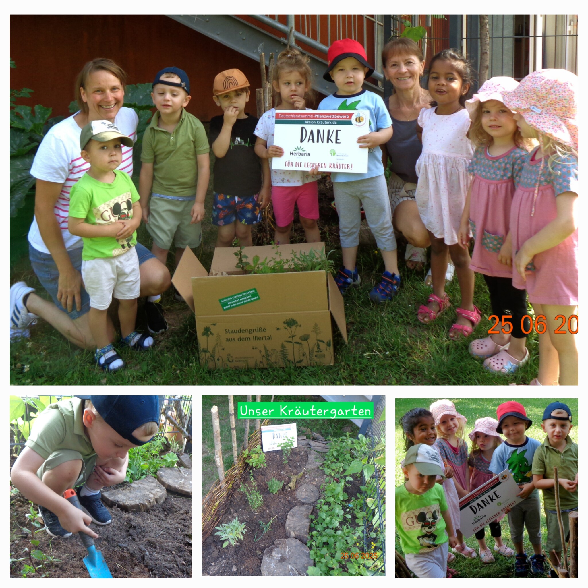 Mit Kräutern und Stauden wird das Beet immer weiter bepflanzt. Jetzt im Sommer blühen schon einige Blumen aus der Samenmischung.Auch das selber gezogene Gemüse wie Kürbis, Zucchini und Tomate ist am blühen. Die Kinder konnten schon viel ernten und schmecken.