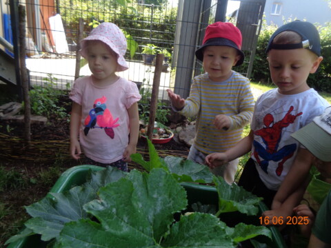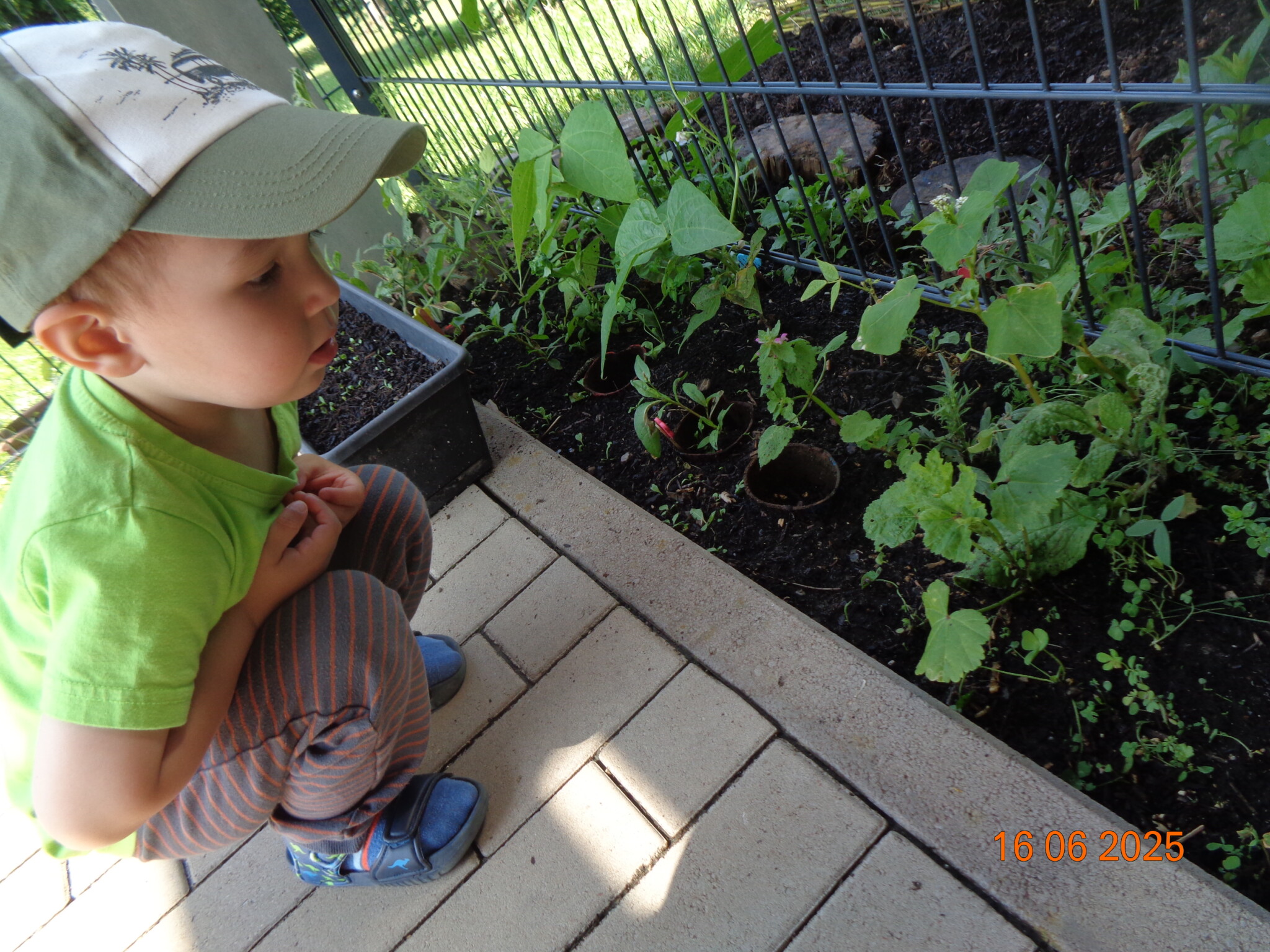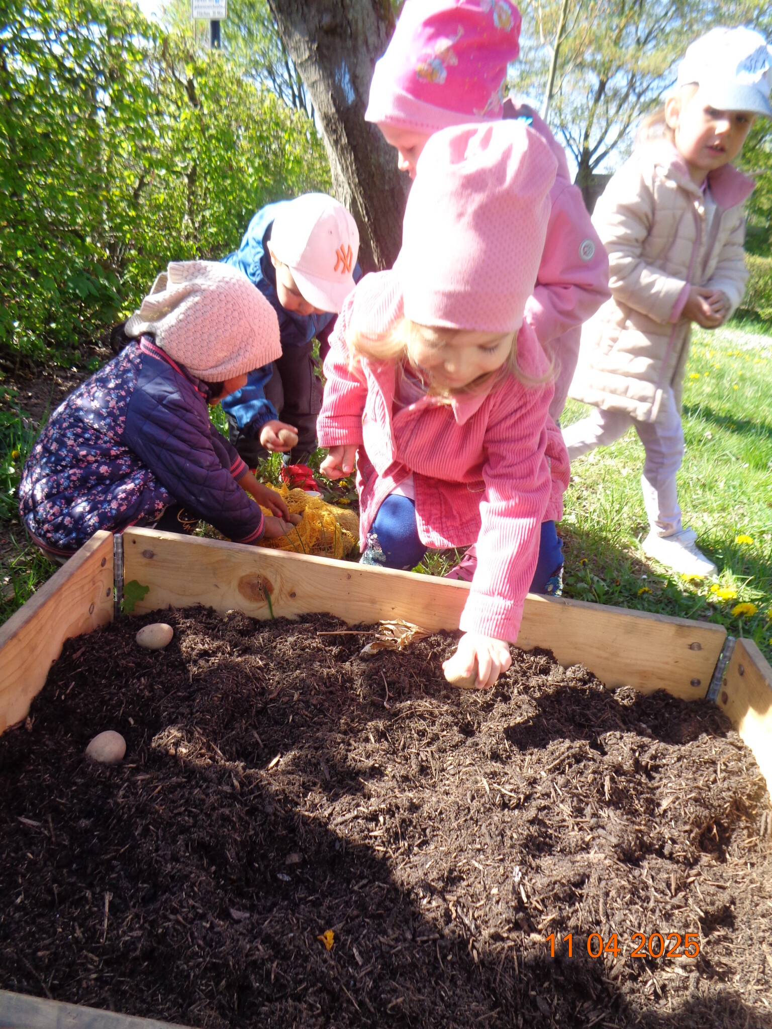 Die älteren Kinder der Gruppe, 7 Kinder im Alter von 3 und 4 Jahren, sind unser “ kleines Gartengemüse“. Neben die Terrasse wurde ein Hochbeet aufgestellt und schon im Frühjahr wurden viele Gemüsepflänzchen gezogen. So sollen sich nicht nur die Bienen an den Gemüseblüten erfreuen, sondern auch wir an einer reichen Gemüseernte.