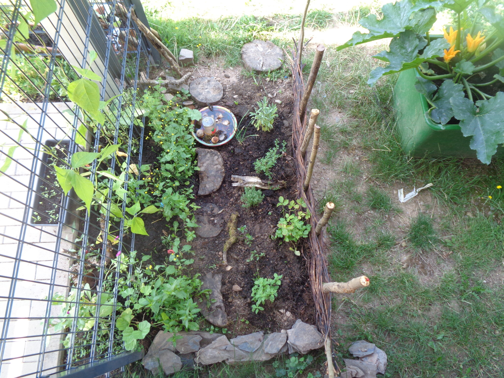 Im Mai sind wir mit unserer Gruppe in den Wald spaziert und haben dort viele Naturmaterialien wie Stöcke, Rinde, Steine, leere Schneckenhäuser und Totholz gesammelt. Mit diesen Schätzen aus dem Wald haben wir unser kleines Beet eingefasst. So ist eine kleine Steinmauer und ein Weidenzaun gebaut worden. Aus den kleinen Fundstücken haben wir eine Bienen- und Insektentränke gestaltet die nun ihren Platz im Beet gefunden hat.