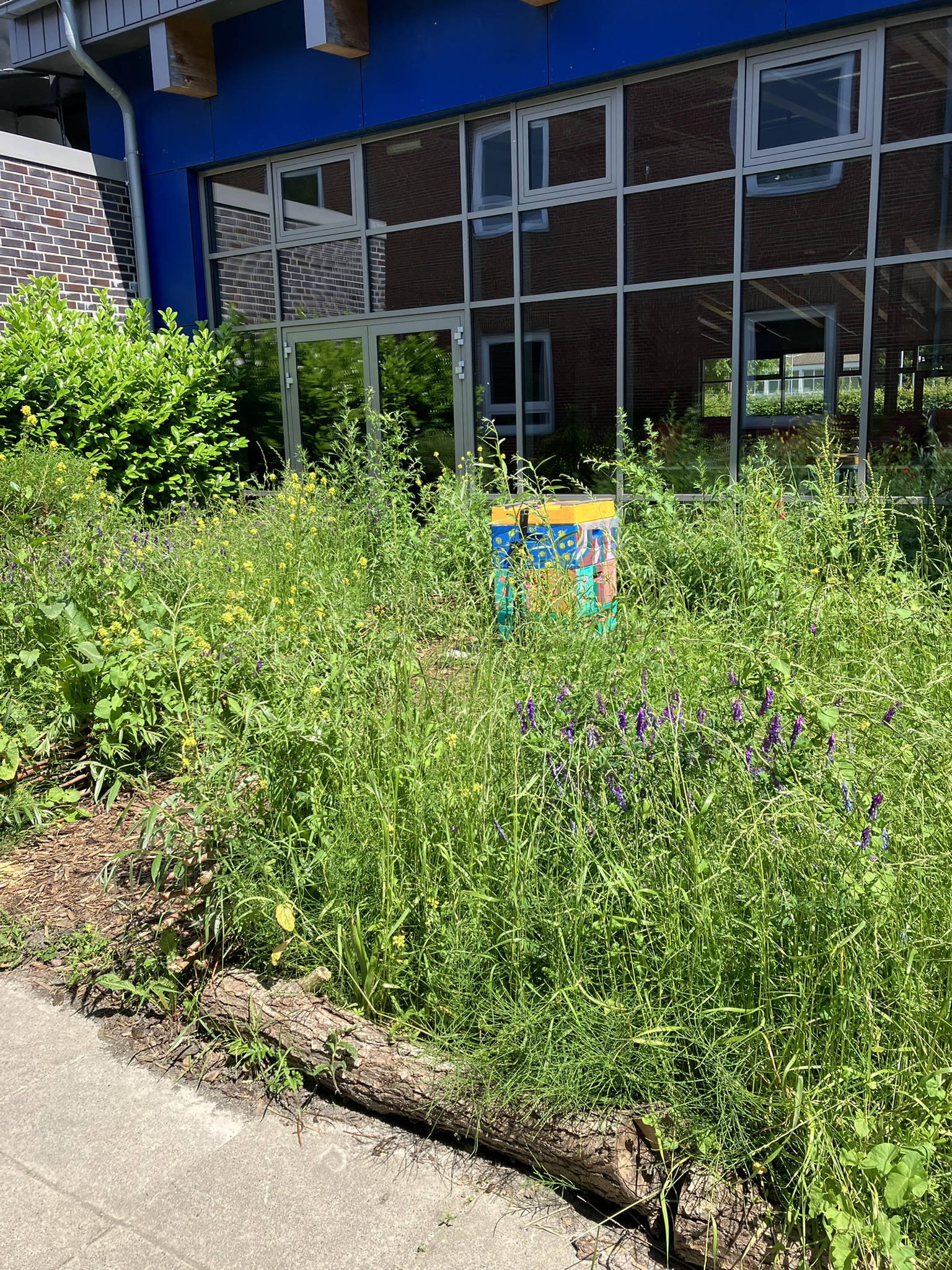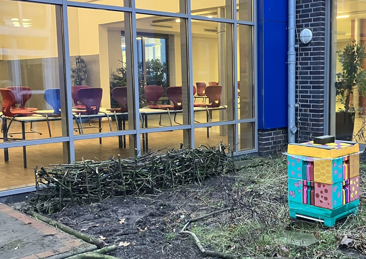 Unser großes Schulgelände lässt sich in vier Bereiche gliedern. Eine Obstbaumfläche mit alten regionalen Obstbaumsorten inmitten des großen Pausenhofs, einen “Paletten-Schulgarten“ auf dem Pausenhof von Jahrgang 5 (Projekt 2), die mit Hochstämmen und Beerensträuchern beflanzte “Beerenstraße“ , die zu unserer “Bieneninsel“ mit unseren schuleigenen Bienenstöcken führt (Projekt 3). Schließlich die “Oase“: ein sich entwickelnder Ruheraum für Insekten, Tiere und Menschen (Projekt 1).