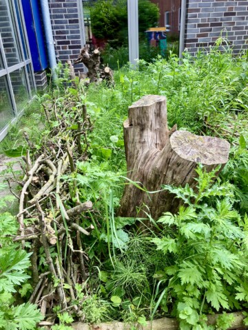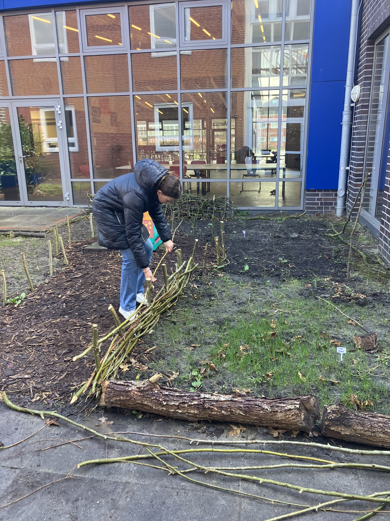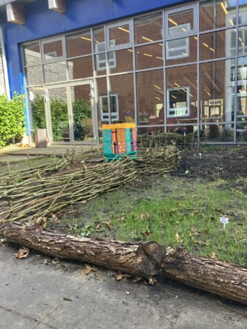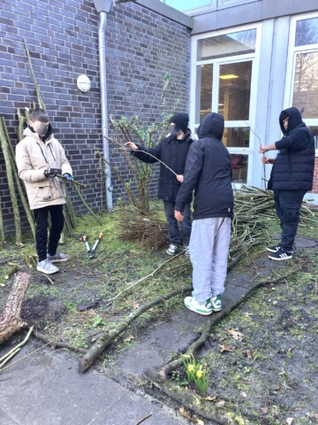 Ein weiteres Ziel unseres Handels ist die Reduzierung der Verwendung von Plastik im Schulgarten: “reduce, reuse, upcycle, … refuse“. Manches lässt sich nicht vermeiden (z.B. die Regentonnen und die Pflanztöpfe). Für den Bau von Zäunen und Beetabgrenzungen verwenden wir jedoch nur Naturmaterialien.