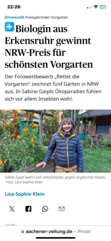 Wahrscheinlich ist es diese Freude, die mich antreibt immer weiter zu machen, mich ständig fortzubilden und möglichst viele Menschen daran teilhaben zu lassen. So kommt eins zum anderen: Teilen von Beiträgen über Social Media, Teilnahme an verschiedenen Wettbewerben, VHS-Vortrag, Presseberichte, TV-Beitrag, Workshop zur Lehrerinnenfortbildung bzgl. naturnaher Schulgartengestaltung, Führungen durch den eigenen Garten und Veranstaltungen für andere Schulen durch unseren Schulgarten.