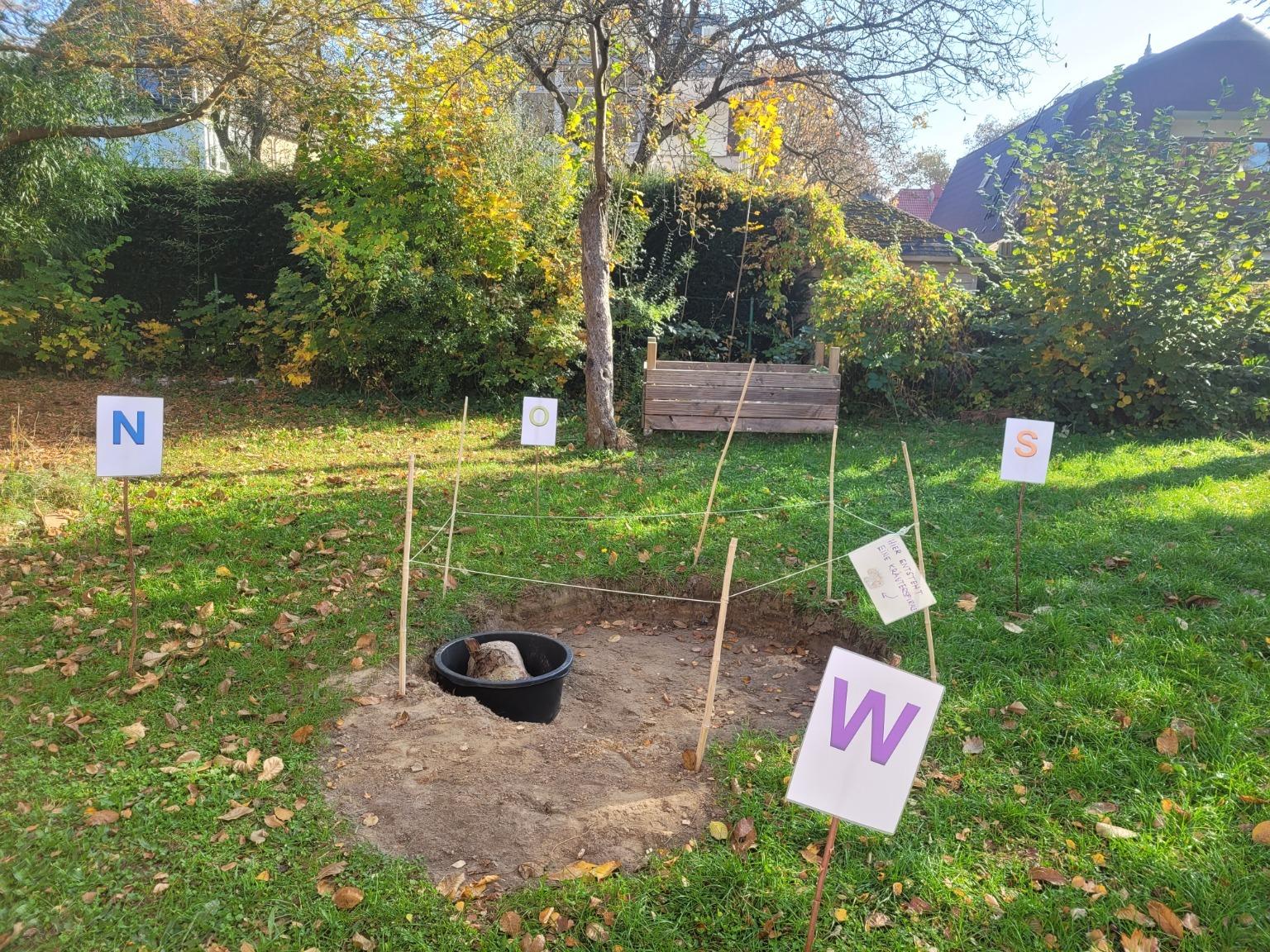 Dieses Vorhaben haben wir der Schulgemeinschaft präsentiert. Der Schulleiter wurde als Erster informiert und die Elterninitiative „Green Team“ wurde am Bord geholt. Anschließend dokumentierten wir den Prozess und es wurde über den Schul-Newsletter an die gesamte Schulgemeinschaft weitergegeben. Die Schulgemeinschaft hat das Unternehmen unterstützt. Bald wurde eine kreisrunde Grube gehoben. Wir haben einen Mini-Teich gekauft, die Himmelsrichtung gekennzeichnet sowie Erde und Kies bestellt.