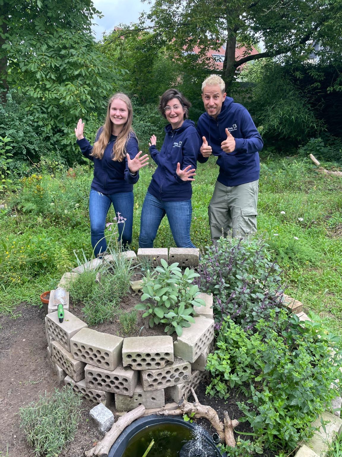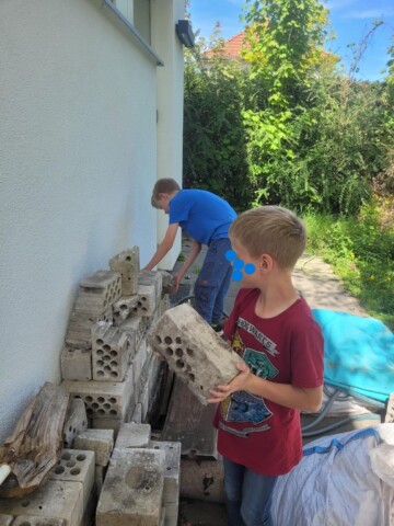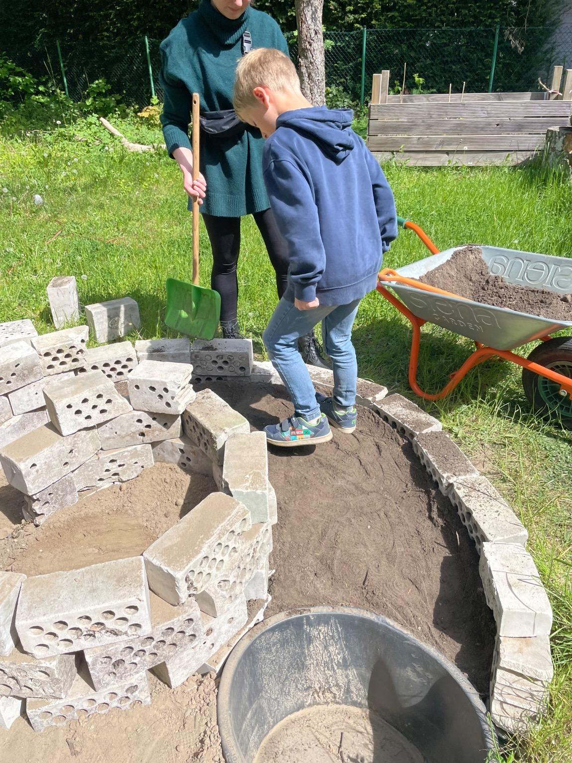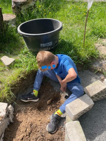 Mit den Kindern wurde ein Kiesbett geschüttet und die Steine zur Spirale angeordnet. Wir haben auf Mörtel verzichtet, sodass Kleintiere in der Mauer ein Zuhause finden. Zur Stabilität wurde abwechselnd befühlt und weitergebaut. Die Grube für den Mini-Teich musste weiter ausgehoben werden. Es wurde darauf geachtet, für jeden Regenwurm ein neues Zuhause zu finden. Im Zentrum wächst die Spirale am höchsten.
