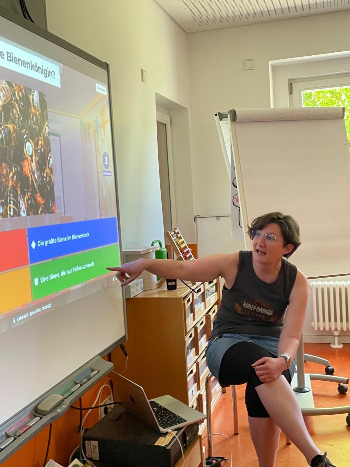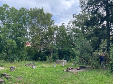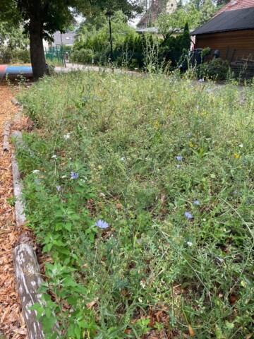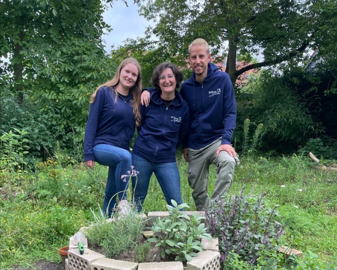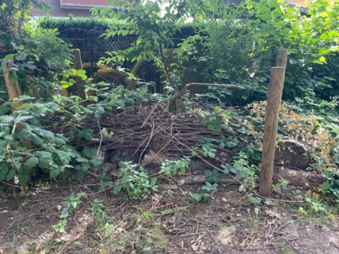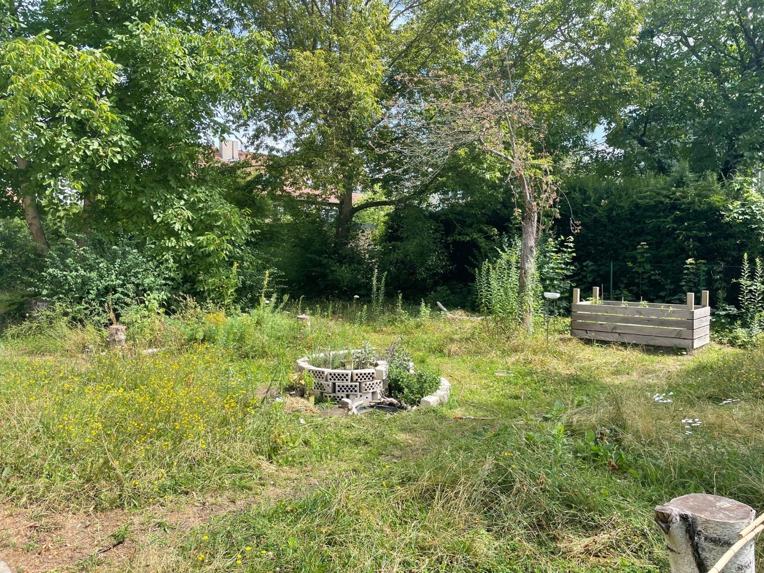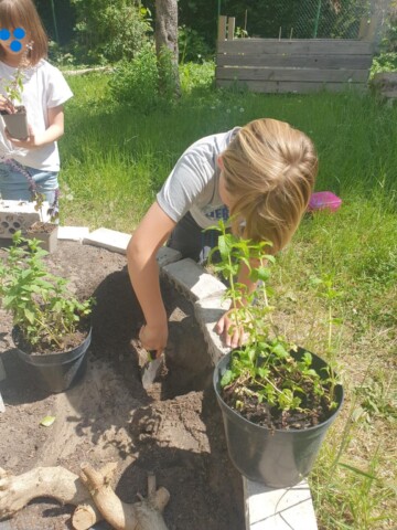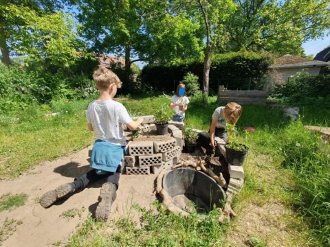 Schon vor zwei Jahren hatten wir den Wunsch gehabt, aus dem verwilderten Garten, hinter dem „Labor“, einen Garten zum Forschen zu gestalten. Mit den Materialien der Stiftung “Kinder Forschen“ (ehemals “Haus der kleinen Forscher“) haben wir den Raum analysiert und die Chancen und Risiken besprochen. Bald wurde klar, dass wir den Versuch unternehmen wollten, Nutzpflanzen anzubauen. Das Projekt soll natürlich klimaresistent werden. Wir haben uns für eine Kräuterspirale entschieden.