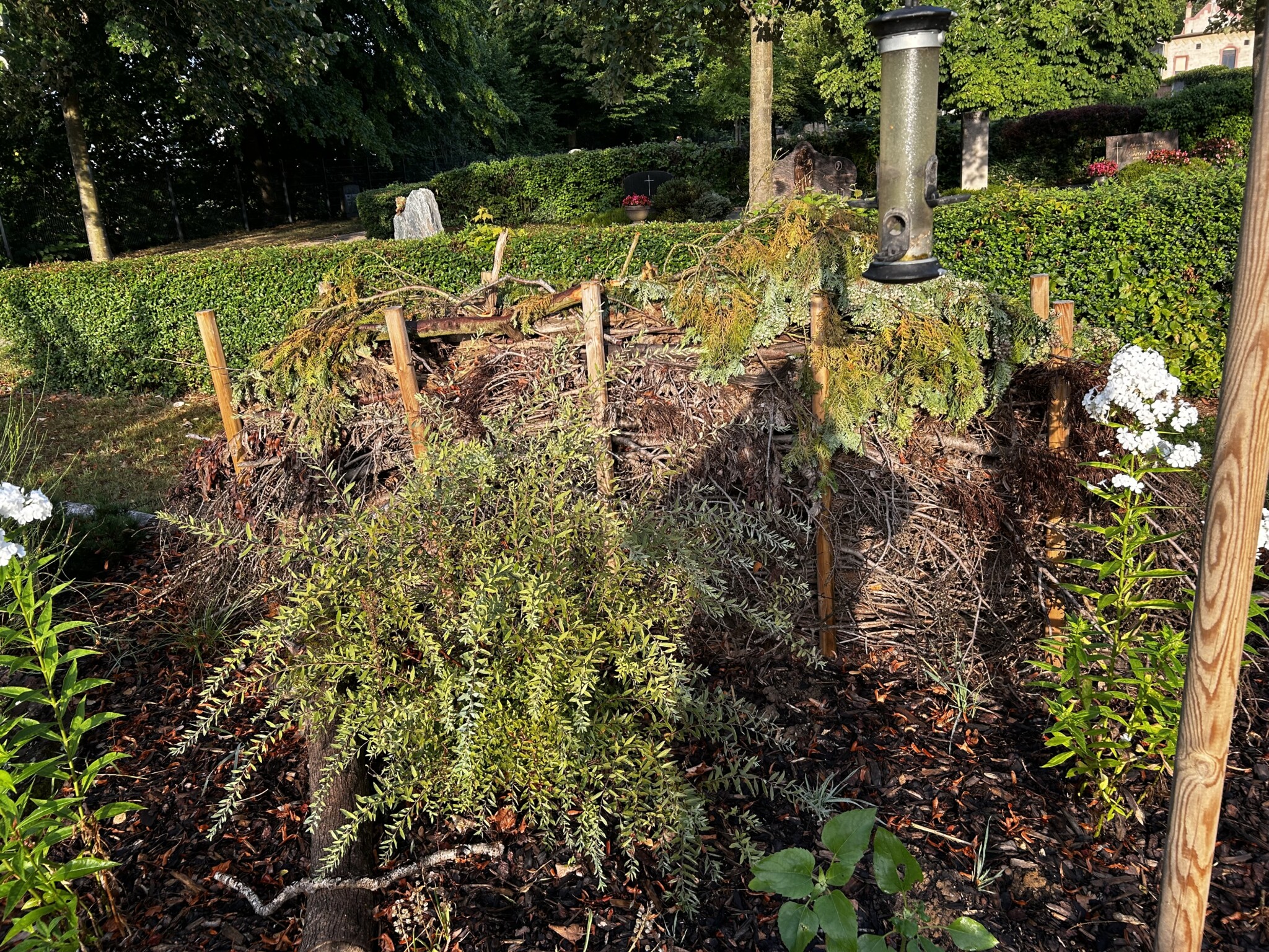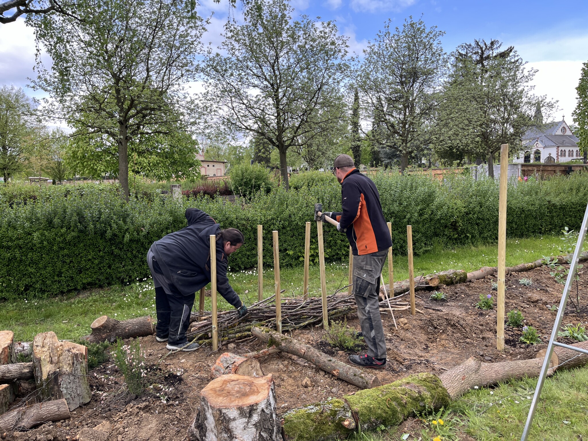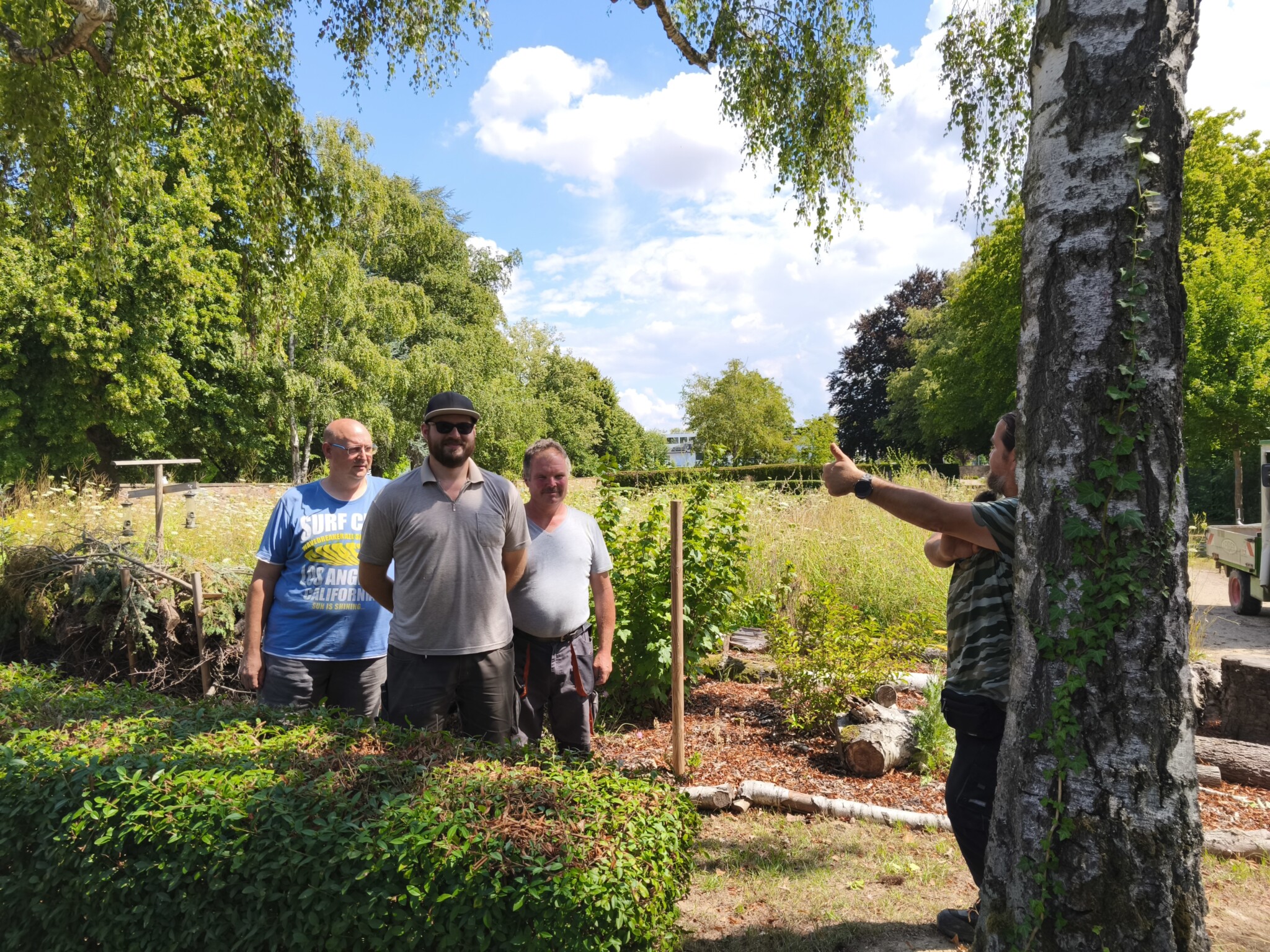 Das Friedhofsteam der Stadt Bad Nauheim, bestehend aus Herrn Michael Welsch, Martin Seibert, Arnold Guckelsberger und Tobias Knöfel, hat in Eigenleistung eine zuvor ungenutzte Freifläche in eine ökologische Ruhezone für Mensch und Tier umgewandelt. Unterstützt wurden sie dabei von Herrn Rudi Nein, ehrenamtlicher Umweltschutzbeauftragter der Stadt Bad Nauheim und erfahrener Naturschutzexperte, der das Team bei der Schaffung ökologischer Nischen fachkundig beraten hat.