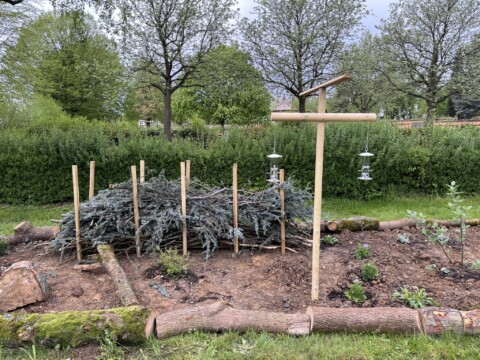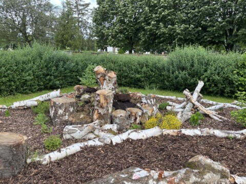 Die Fläche wurde in mehreren Abschnitten naturnah gestaltet. Sie umfasst ein Pflanzbeet mit Stauden und Wildblumen sowie strukturreiche Elemente wie Steinhaufen, Baumstämme, eine Greifvogelstange und einen Futtergalgen zur Förderung der Artenvielfalt. Diese Elemente bieten Lebensräume für Insekten, Kleintiere und Wildvögel.