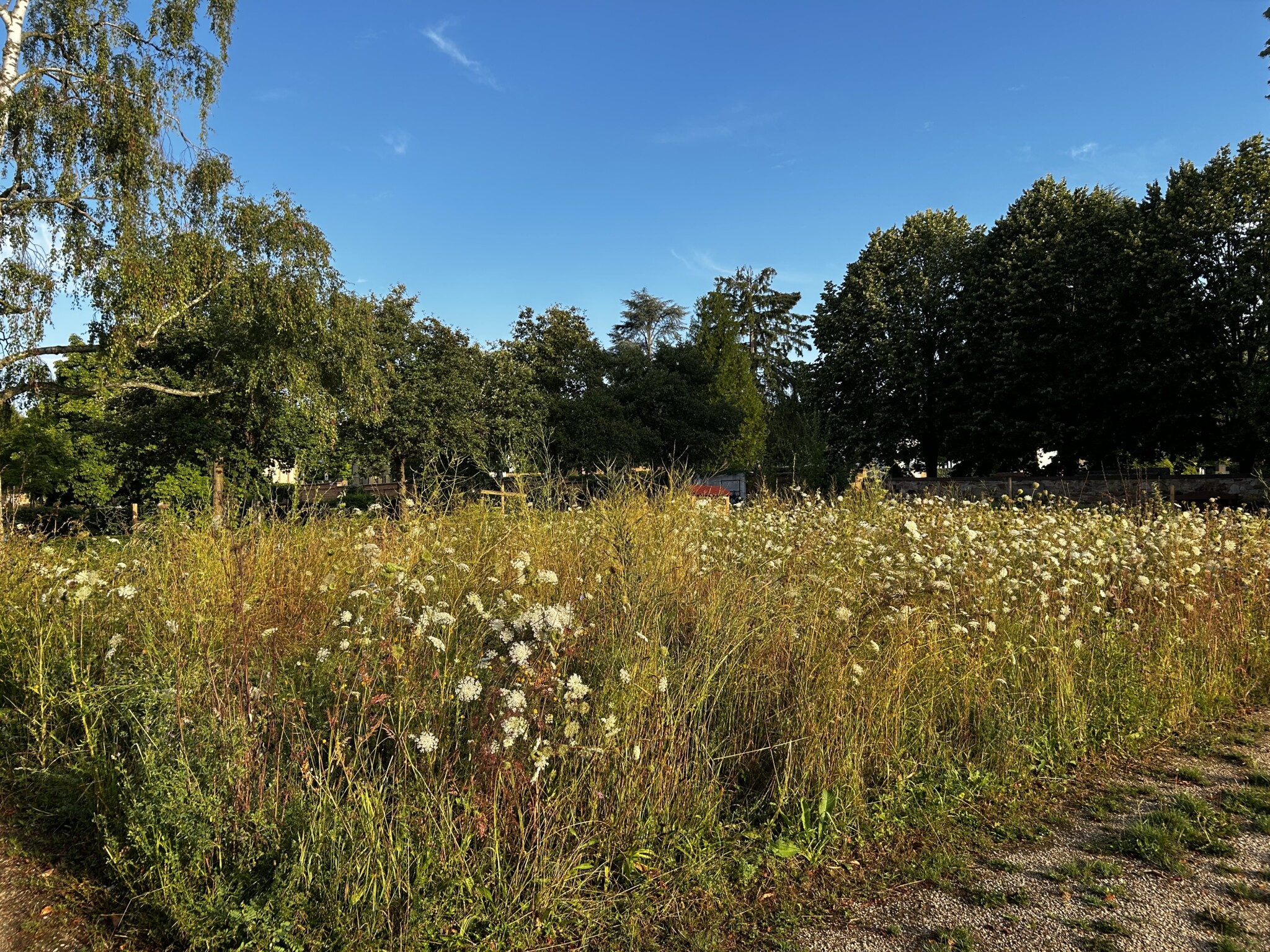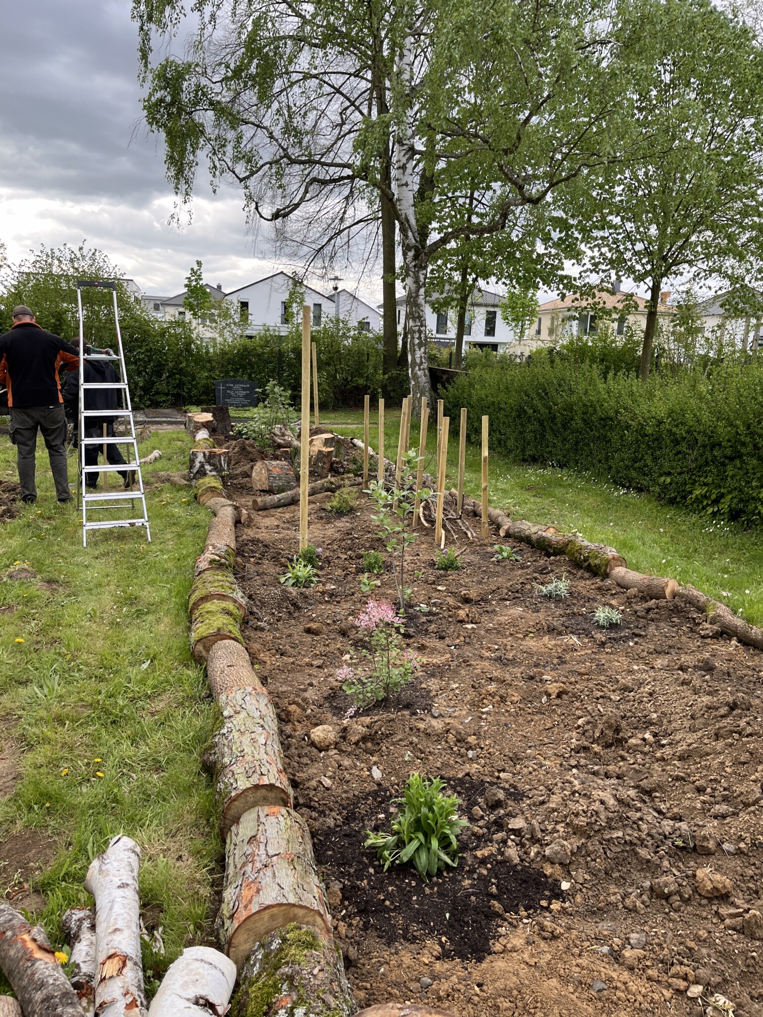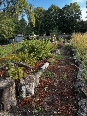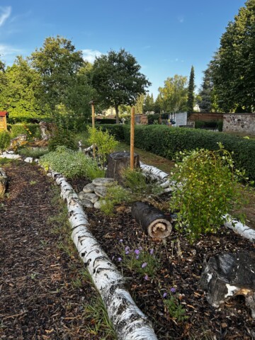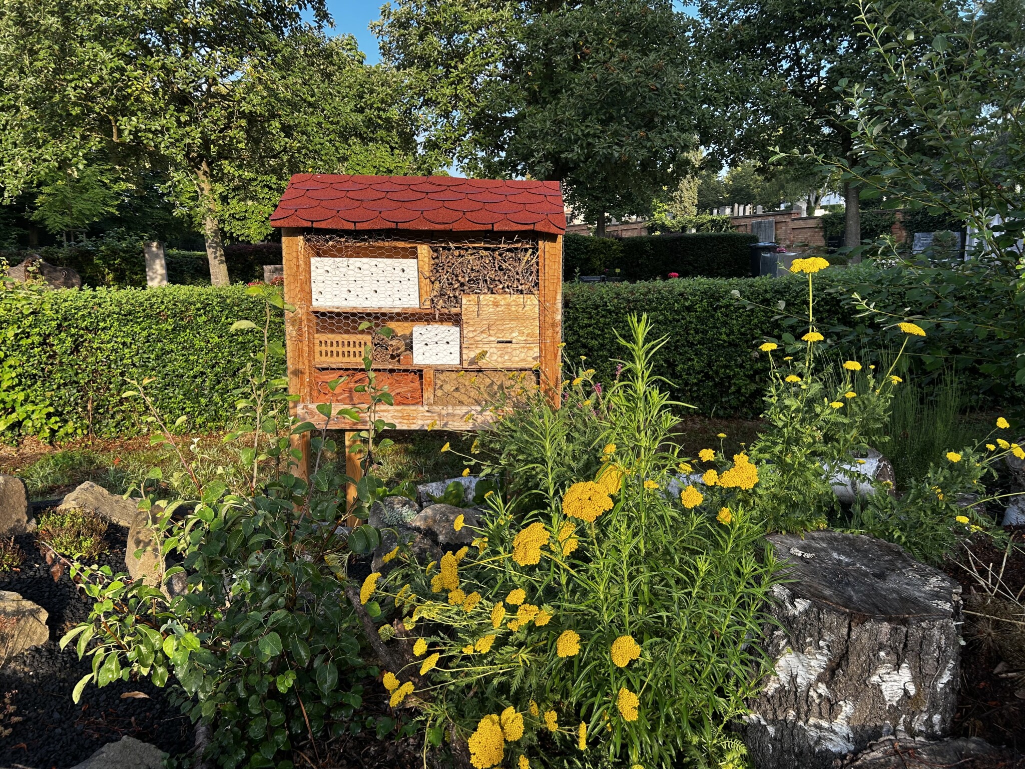 Im Beet befindet sich außerdem ein selbstgebautes Insektenhotel. Ergänzt wird die Fläche durch verschiedene naturnahe Strukturen, die gezielt Lebensräume für Tiere schaffen und Beobachtungen in ihrer natürlichen Umgebung ermöglichen. Die angrenzende Wildwiese bleibt weitgehend unbeeinflusst und entwickelt sich frei. Durch eine vielfältige Zusammensetzung aus Gräsern und Wildblumen entsteht ein wertvoller Lebensraum für Insekten sowie eine Nahrungsquelle für Vögel und Kleinsäuger. Die Pflege erfolgt extensiv und erhaltend. Die Auszubildenden der Stadt Bad Nauheim werden die Anlage im Zuge der Einführungswoche besuchen, dazu informiert und erste praktische Übungen durchführen. Dies wird im August 2025 gestartet und ist für die Folgejahre eingeplant. Außerdem eignet sich die Anlage auch hervorragend für Bildungszwecke, etwa zur Umweltbildung von Schulklassen. Eine intensivere Einbindung in die Öffentlichkeitsarbeit ist zukünftig geplant.