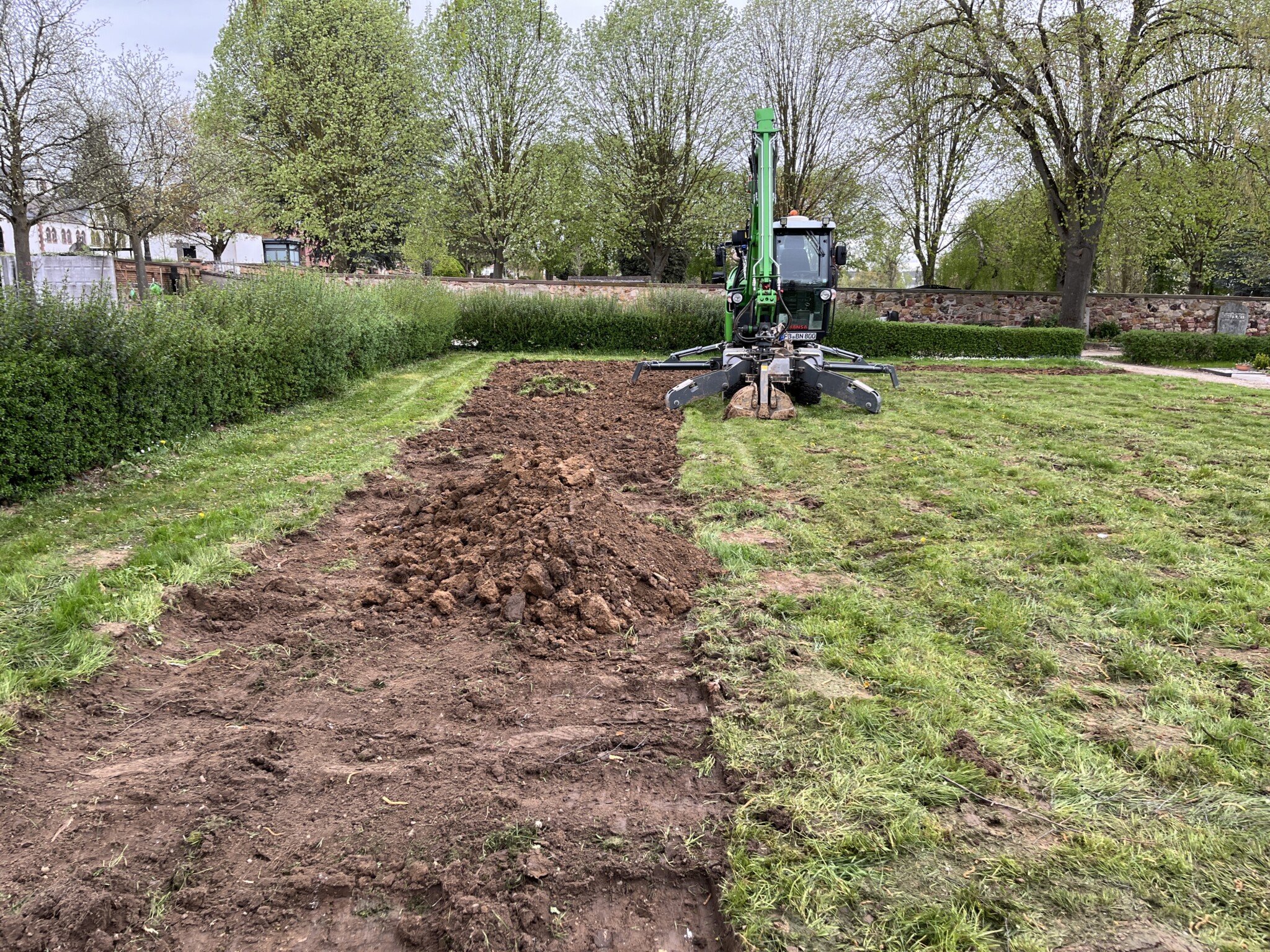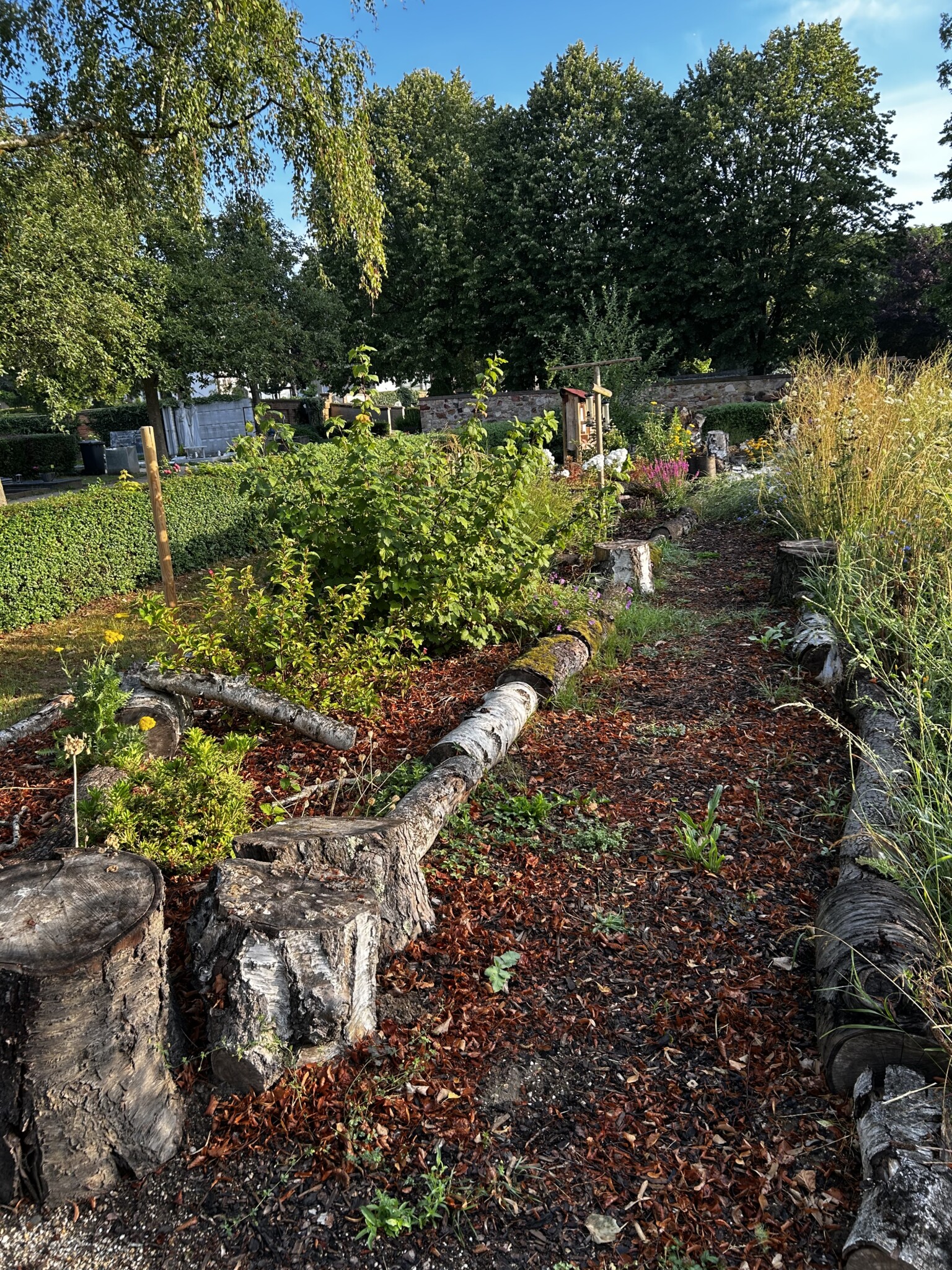 Ein begleitender Mulchweg ermöglicht es Besuchenden, die Grünfläche zu durchqueren und erleichtert gleichzeitig die Pflegearbeiten am Beet. Aufgrund des hohen Kompostaufkommens am Friedhof werden hier regelmäßig Stauden aus der Friedhofspflege wiederverwendet, die andernfalls entsorgt würden. Dies unterstützt ein nachhaltiges Flächenmanagement und reduziert Kosten bei der Beetpflege.