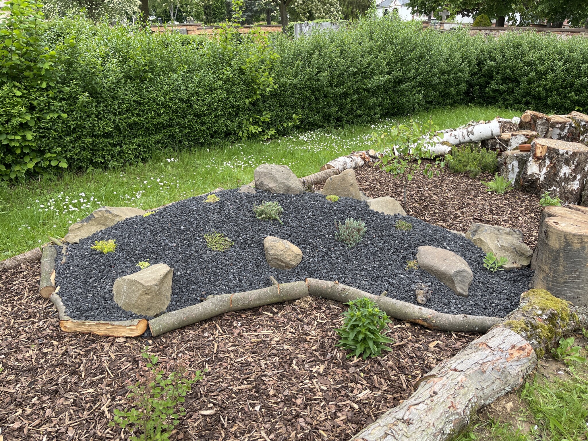 Die Pflege der Fläche erfolgt bedarfsorientiert im Rahmen der allgemeinen Friedhofspflege. Dabei wird unerwünschter Aufwuchs entfernt und die vorhandene Pflanzung – Stauden wie Gehölze – fachgerecht erhalten und gefördert.