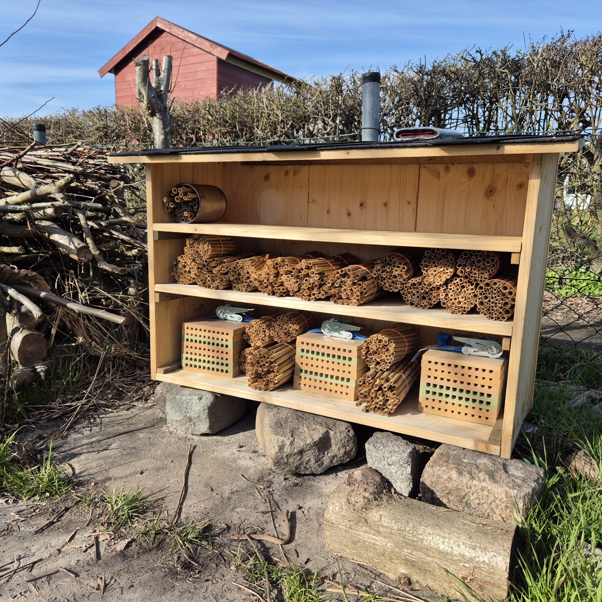 Für eine vielseitige Blütenvielfalt im Garten ist gesorgt, aber ein zu Hause für die sechsbeinigen Bewohner sollte her. Fachliche Beratung für eine Nisthilfe haben wir beim Wildbienen-Experten Johann-Christoph Kornmilch gefunden und in einem Mini-Workshop eine komfortable Unterkunft gebaut. Den „Innenausbau“ mit Nistblöcken, Schilf & Co haben wir im Frühjahr 2025 fertiggestellt und uns über die ersten Mauerbienen gefreut.