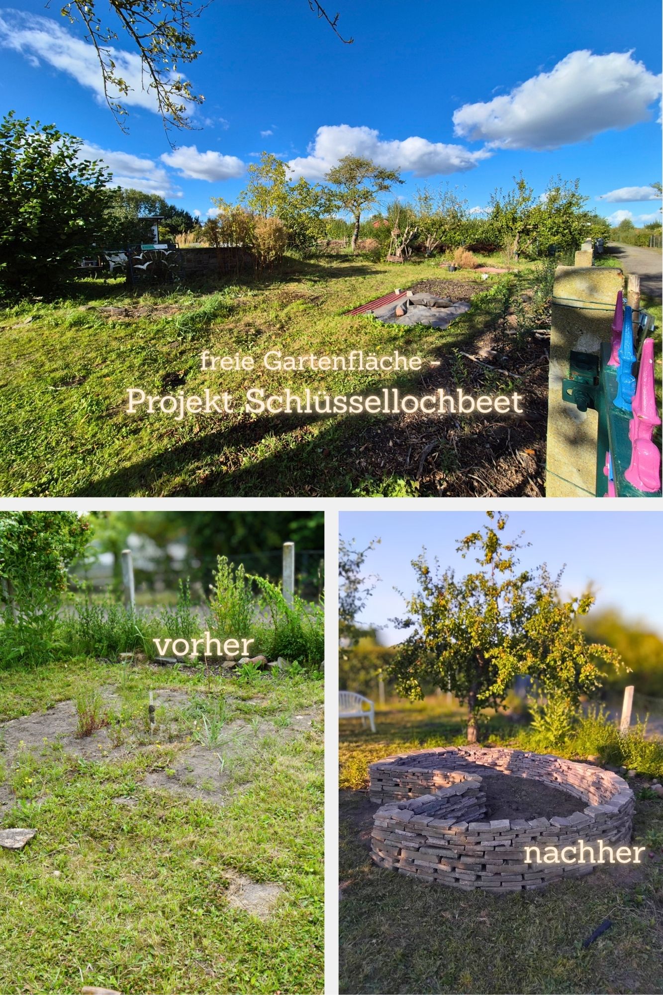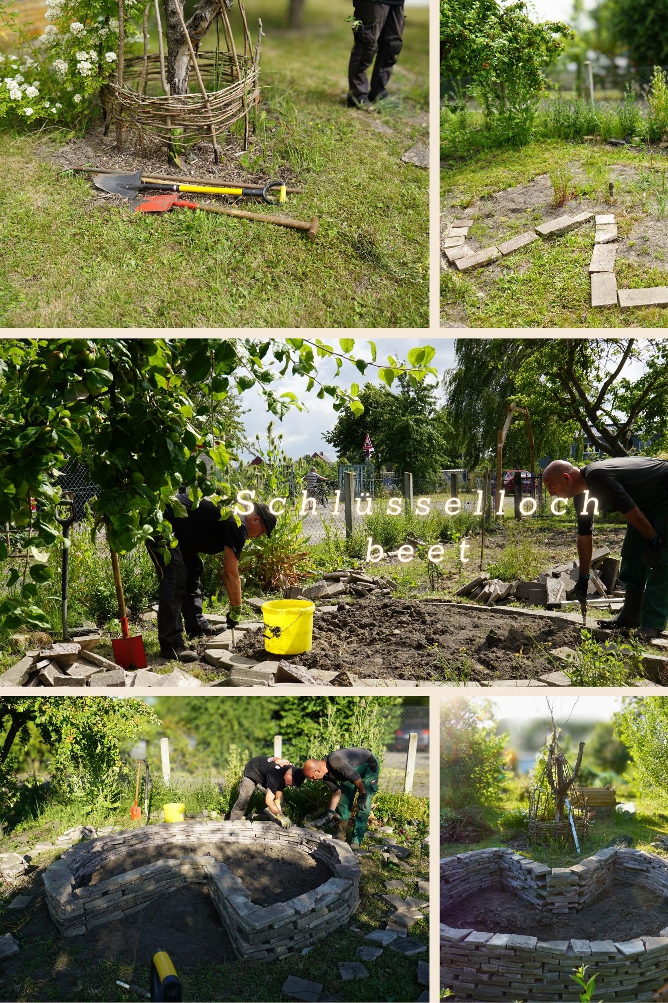 Spontan beschließt ein Teil des Garten-Teams, dass jetzt(!) der Zeitpunkt für ein neues Gartenelement da ist. Los geht es mit dem Bau eines Schlüssellochbeetes (Ø 2,80m). Ein Upcycling alter Gehweg-Platten ist dabei angesagt. Die Steine wurden gleich so arrangiert, dass Pflanzen und tierische Bewohner in die Fugen einziehen können.