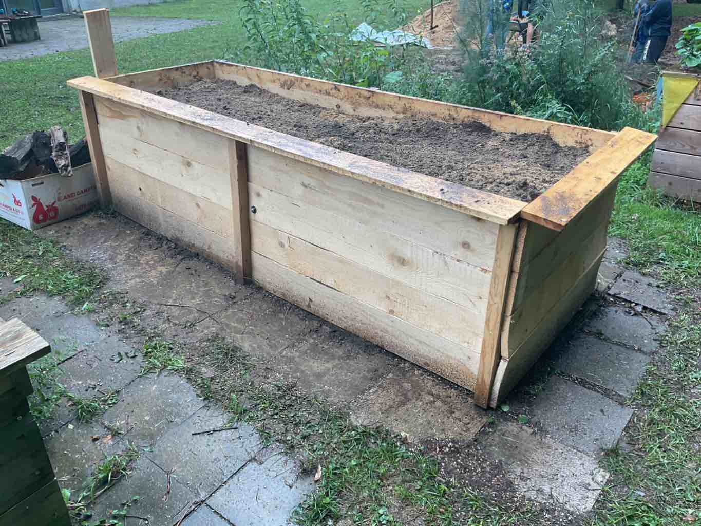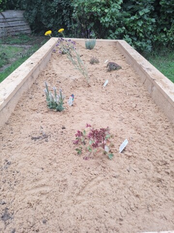 Direkt daneben haben wir ein Hochbeet als Futterstelle gestaltet. Dort wachsen Kräuter und Wildpflanzen, die Insekten besonders gerne mögen – zum Beispiel Thymian, Verbene oder Lavendel. So müssen die Bienen nicht weit fliegen, um Nahrung zu finden.