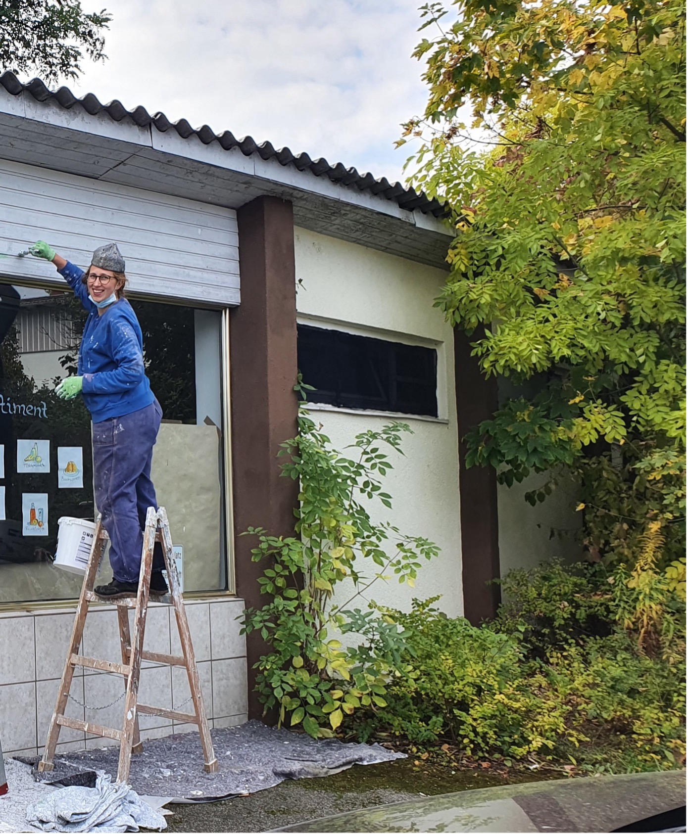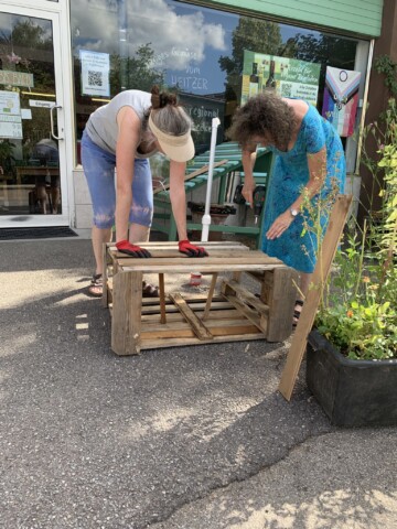 Das Projekt ist in einem workshop zur Ladengestaltung entstanden, bei dem zunächst 8 GenossInnen beteiligt waren. Bei unserem ersten Treffen haben wir auch den Laden von außen kritisch betrachtet und festgestellt, dass die Töpfe zu klein sind und die Pflanzung attraktiver und vielfältiger gestaltet werden kann. So entstand die Idee zu kleinen Hochbeeten, die wir auf den Asphalt stellen, mit mehr Vielfalt an Pflanzen ausstatten können und die dann auch von den Autofahrenden besser gesehen werden. Zudem ermöglichen sie die Verarbeitung von Einwegpaletten, die im Laden angefallen sind. Zwei Mitarbeitende wollten an dem Projekt arbeiten. Eine weitere kam dann dazu. Da in unserem Laden viel ehrenamtlich gearbeitet wird, Menschen im Ruhestand mitarbeiten und viele von uns schon lange ökologisch und gärtnerisch unterwegs sind, konnten wir auf unser eigenes Wissen und Erfahrung zurückgreifen. Eine ehemalige Lehrerin hatte zudem früher mit SchülerInnen schon Hochbeete gebaut. Von ihr kam im Laufe der Zeit auch die Idee, ein HochBeet an der Südseite mit Insektennistholz auszustatten. Sie stellt auch das passende Material zur Verfügung und bohrte die Löcher in der richtigen Größe.