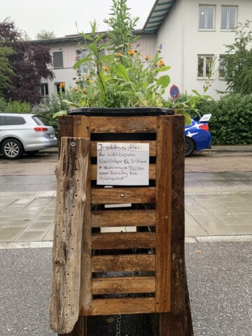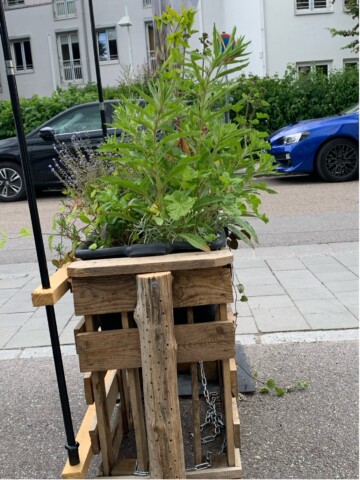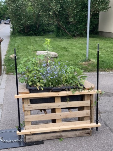 Aus der Tatsache heraus, dass die Töpfe zu klein sind und deshalb von den Parkenden oft angefahren werden, entstand die Idee zu kleinen Hochbeeten. Diese entstehen nun aus Upcycling-Material in ehrenamtlicher Arbeit und werden mit vielfältigen Blüh-Pflanzen bepflanzt.