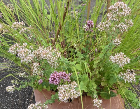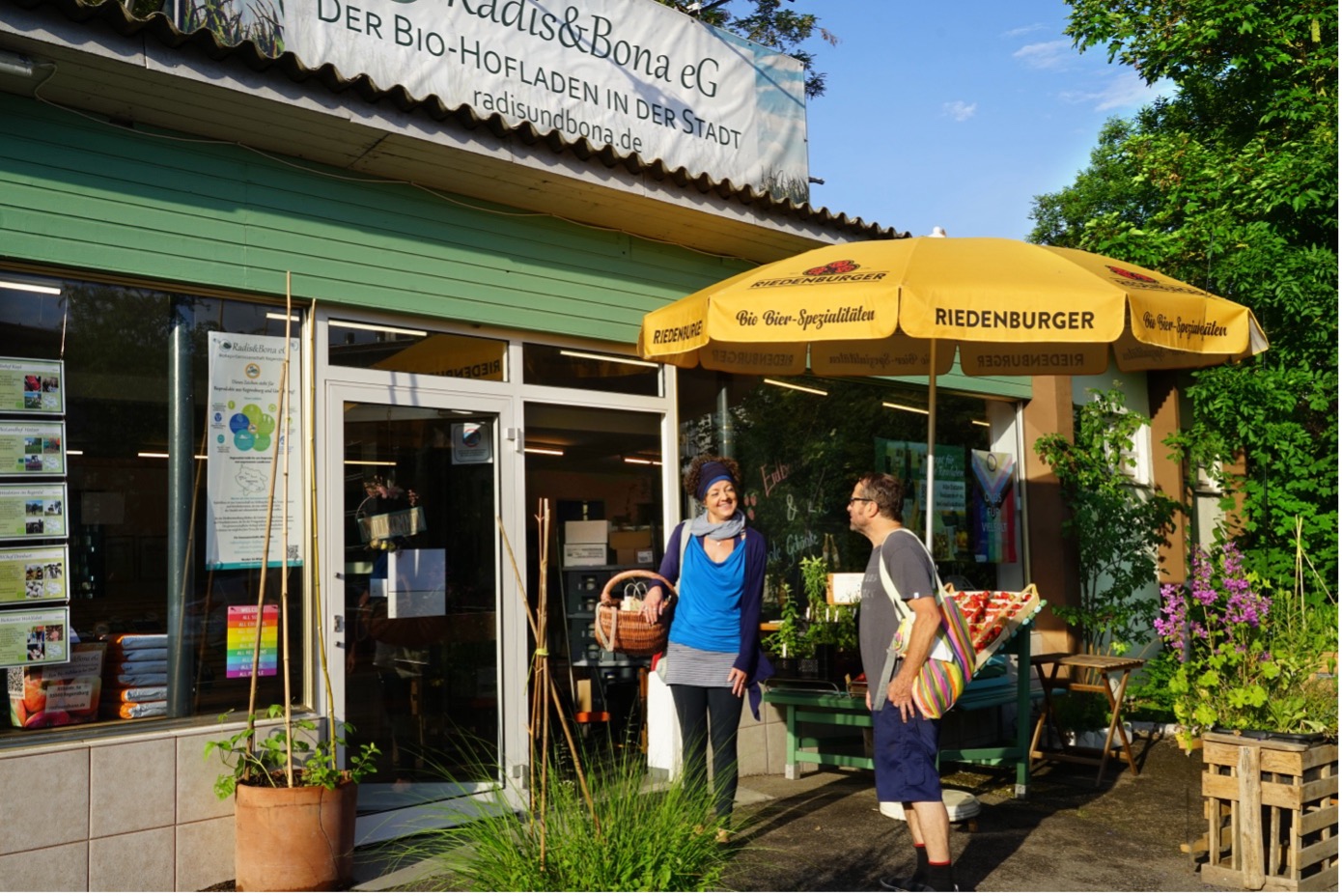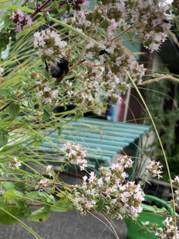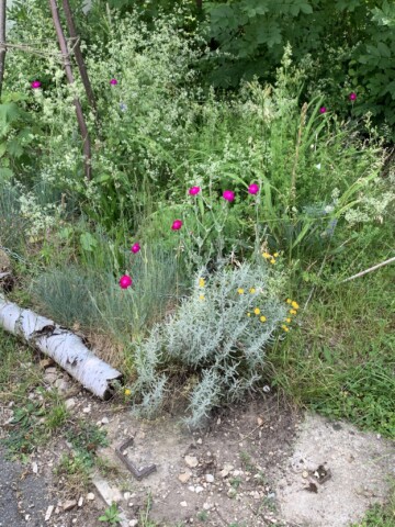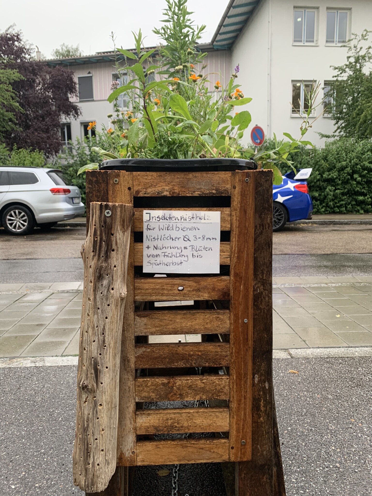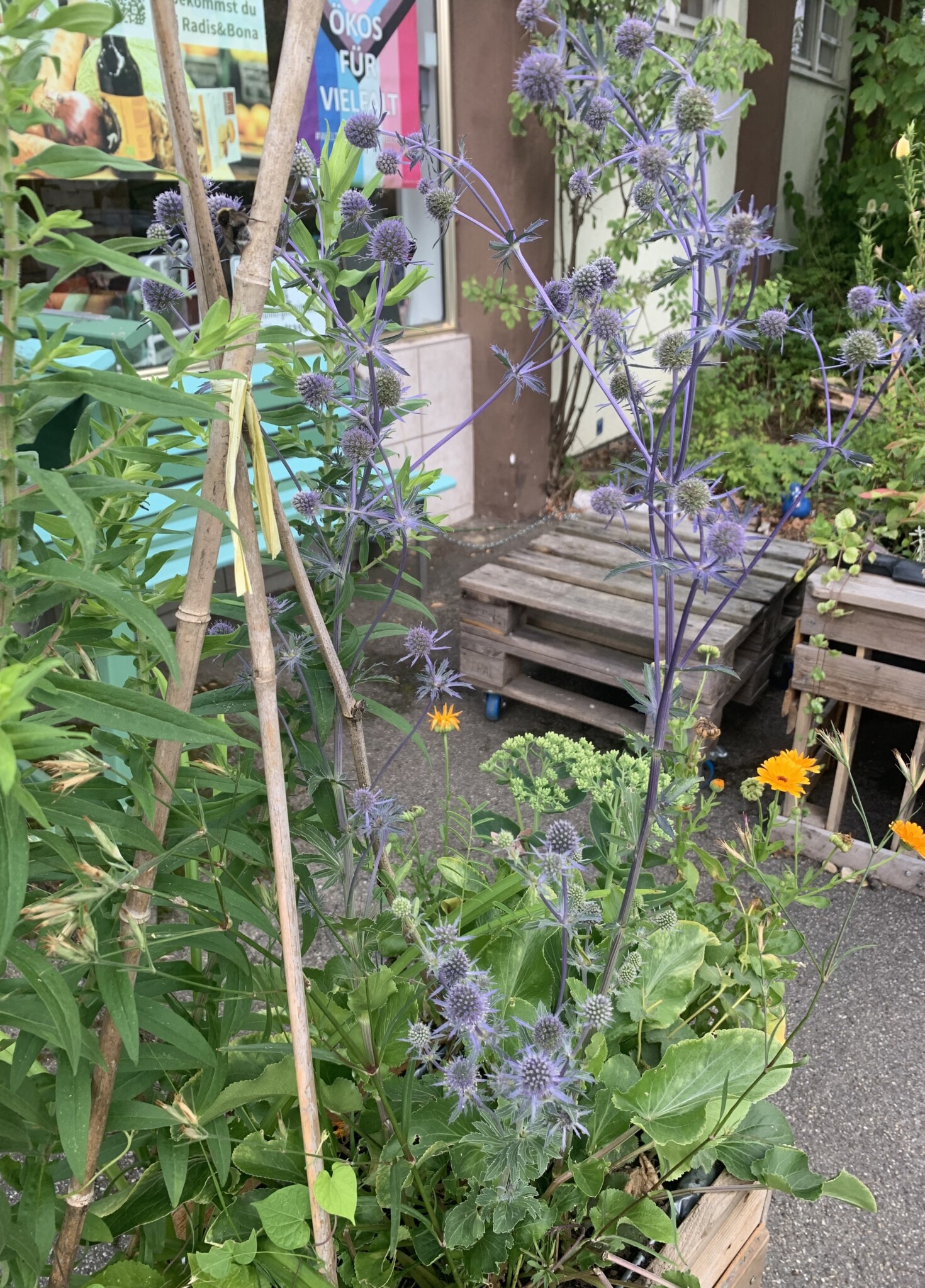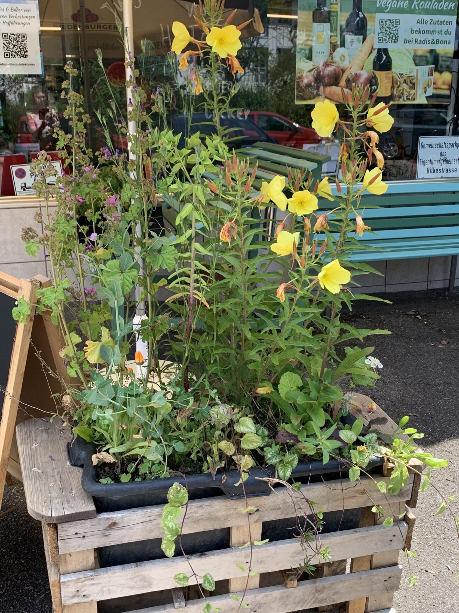 Wir sind ein Bio-Regio-Genossenschaftsladen von Erzeugenden und Verbrauchenden, im 4. Jahr seit Gründung. Uns ist also das Thema Insektenfreundlichkeit von Grund auf bekannt und wichtig. Vor dem Laden, der gemietet ist, befindet sich eine zugeteerte Parkfläche von ungefähr 5 Parkplätzen, die wir bisher mit Blumentöpfen und einer Bank verschönert haben, auch als Abgrenzung für die Parkenden. Ebenso haben wir das Beet neben dem Laden, das eigentlich nicht mitgemietet ist, mit mehr Vielfalt bereichert.
