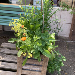 3 Hochbeete sind schon bepflanzt, aber noch nicht perfekt im Aufbau. Permakulturistisch erfüllen sie immer mehrere Aufgaben: Abgrenzung und Schutz, Werbung, Sitzgelegenheit, Insektennistkasten, Insektenfutterstelle und Schönheit. Sie sollen immer auch für die ganzheitliche Sichtweise in unserem Laden stehen. Außerdem steht ein Topf mit Stangenbohnen vor der Tür. Dies war letztes Jahr eine Aktion mit dem Kindergarten nebenan.