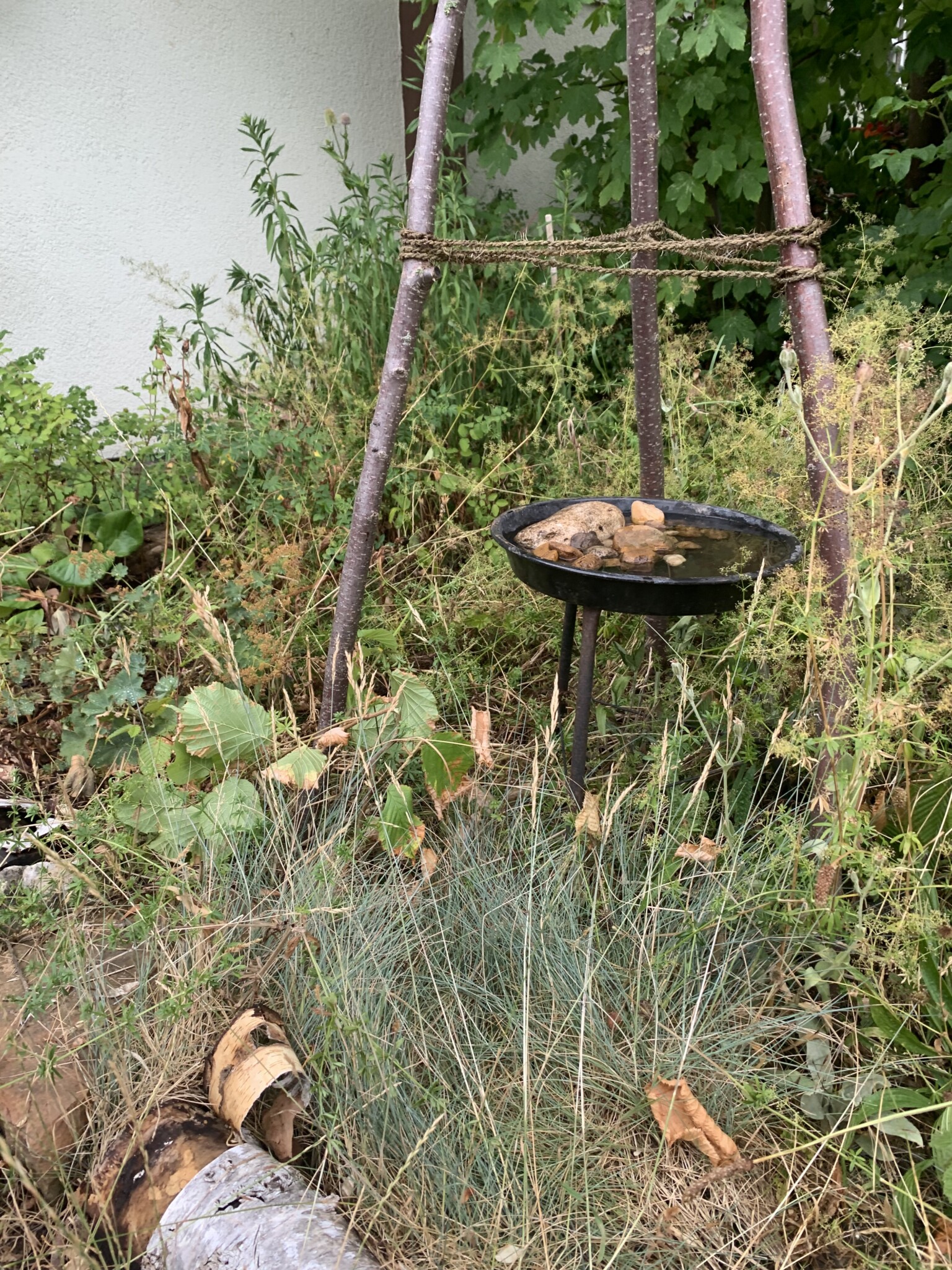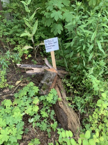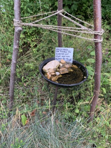 Zudem gibt es jetzt 2 bis 3 Mitarbeitende, die ehrenamtlich 1 mal wöchentlich die Beete pflegen: Verblühtes abschneiden, gießen, harken, Hochbeete den Erfordernissen anpassen, im kleinen Beet im Herbst Samen von trockenresistenten Pflanzen säen, wildwachsende Bäume entfernen, Totholz ergänzen, Wasser in der Tränke nachfüllen und sauber halten.