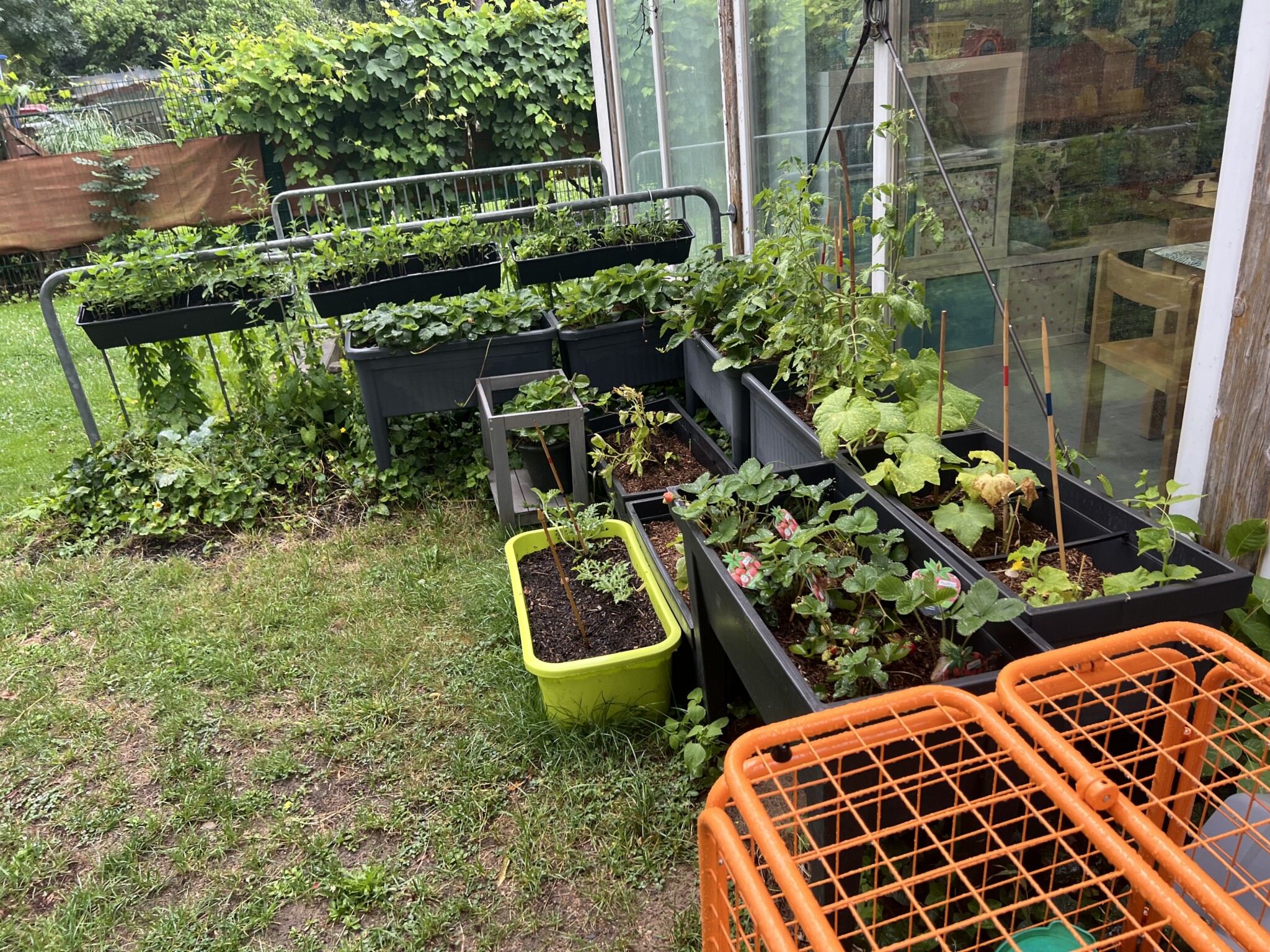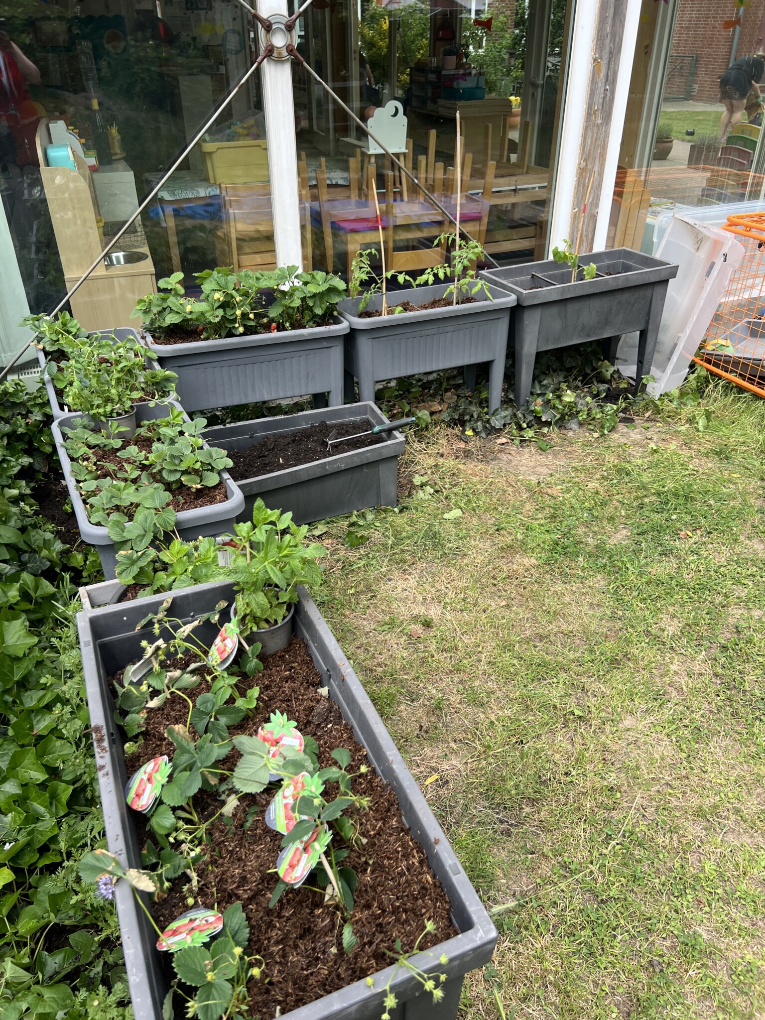 Unsere Erdbeeren haben wir in Reihen an einem sonnigen Standort in kleinen Hochbeeten mit fruchtbarem, gut durchlässigem Boden gepflanzt. Sie bieten Nektar für Bienen und können durch die Kinder nun bis Ende Juli geerntet werden.