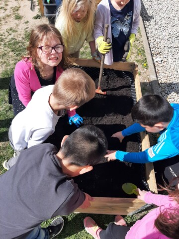 Aktion für unsere Grundschüler: Wir haben weitere ‚Gemüsekisten‘ angelegt. Hier wachsen ‚gute Nachbarn‘ zusammen in einer Kiste. Die erste Ernte wird die Kresse sein und wir können leckere Kressebrote herstellen.