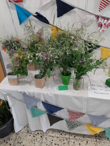 Neben diesen hübschen Sträuße und Upcycling-Girlanden haben wir getonte Kresseigel und Insektensteine angeboten