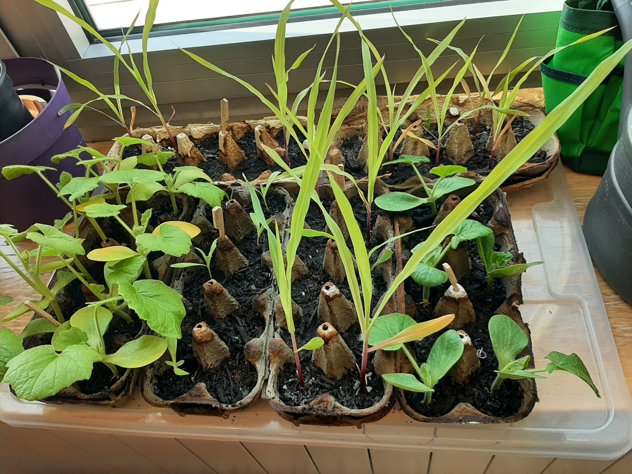 Mais, Tomaten, Sonnenblumen, Gurken, Borretsch, Kürbis und Ringelblumen haben wir vorgezogen