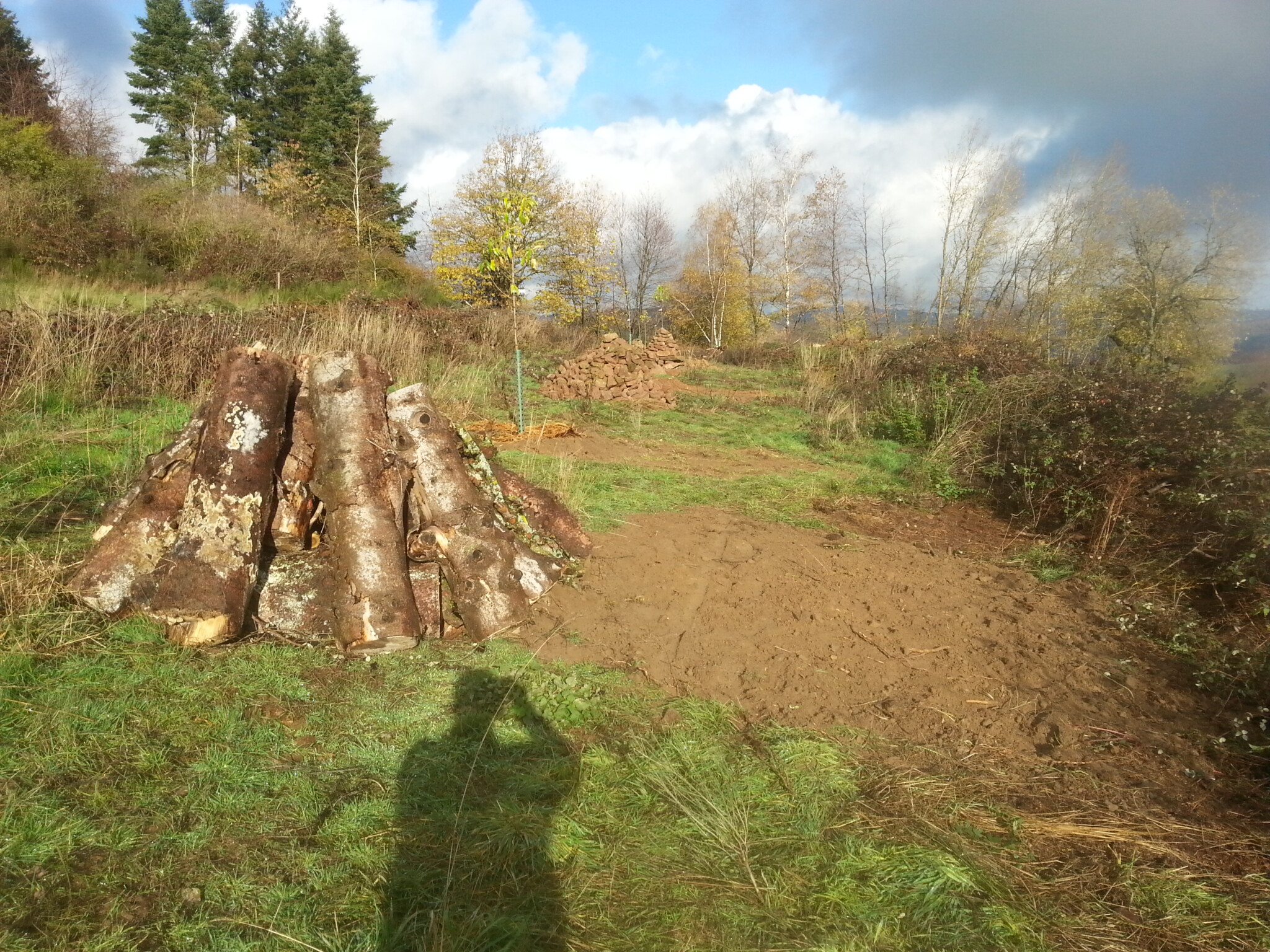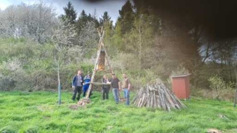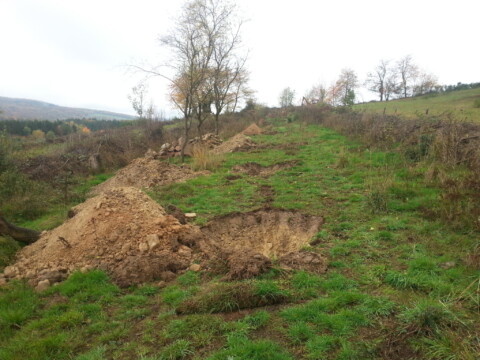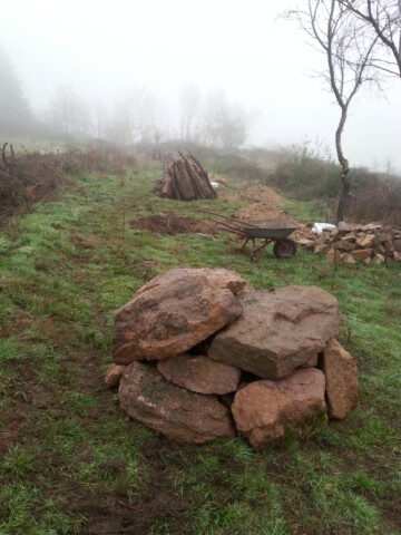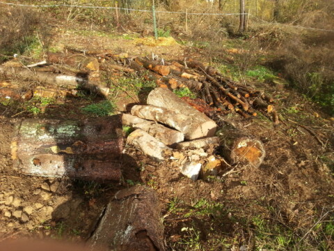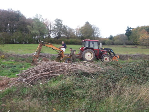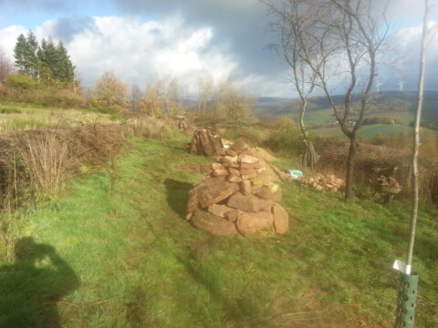 Die anfallenden Äste und Holzstücke wurden für die geplanten Heckenstreifen in Anlehnung an eine Benjeshecke aufgeschichtet. In diesen Totholzstreifen wurden mehrere heimische Sträucher gepflanzt um eine Schutzhecke zu erzeugen.