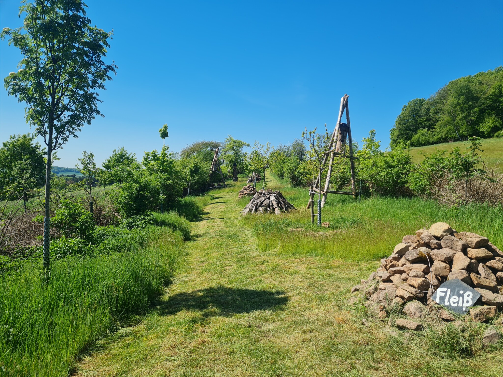 Ergänzend zu dieser Fläche wurden der eigene Garten (HORTUS DELICIARUM) und die angrenzende Wiesenfläche mit mehreren Maßnahmen naturnäher verändert.