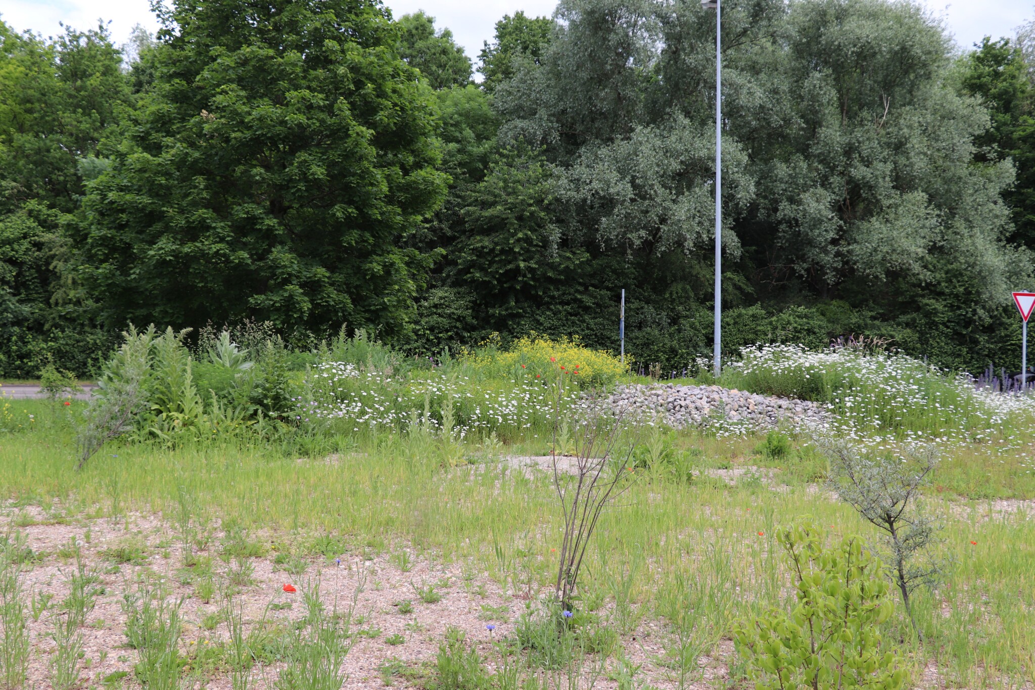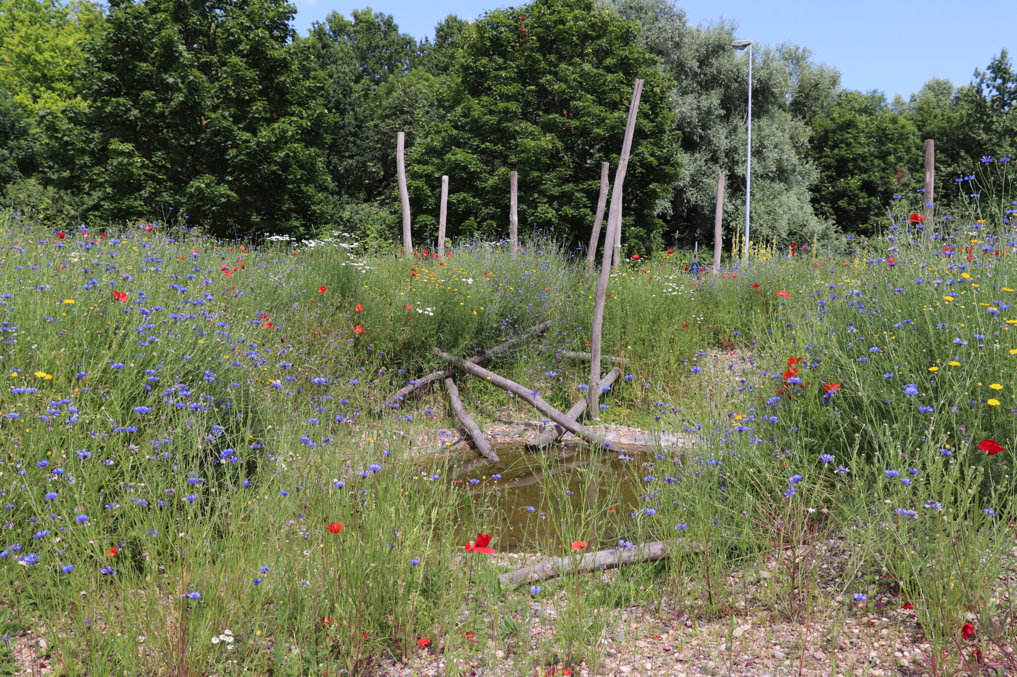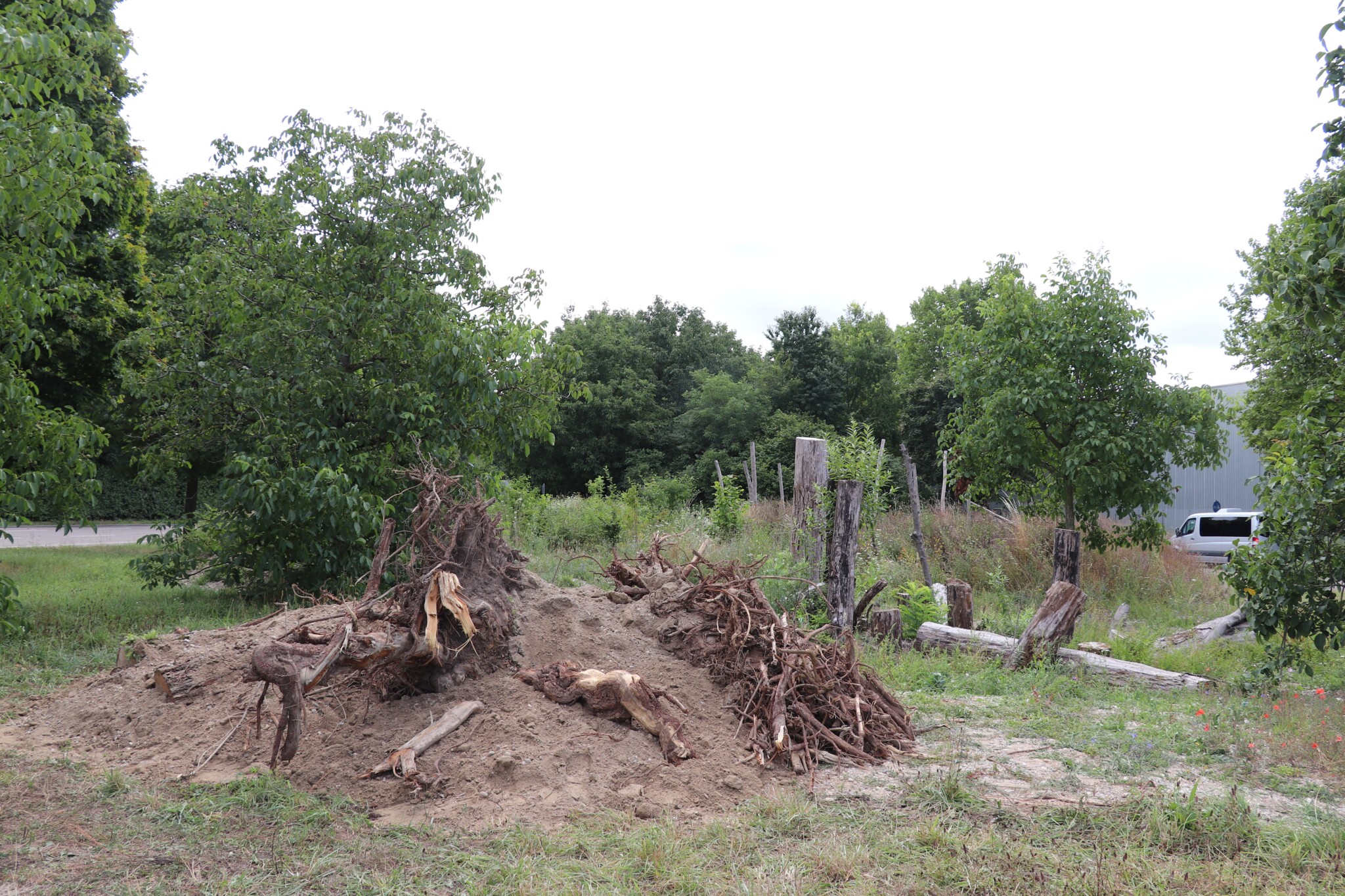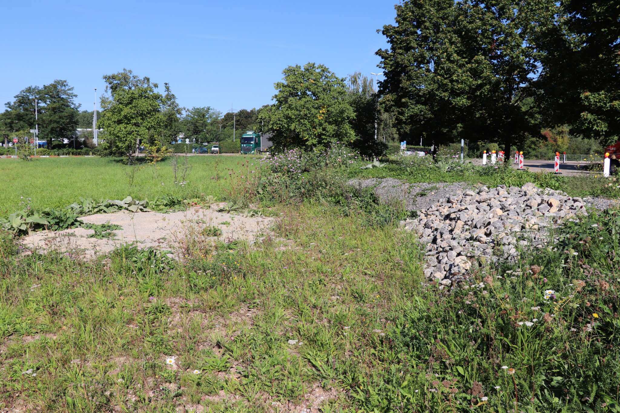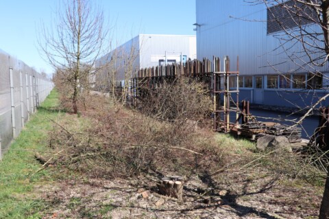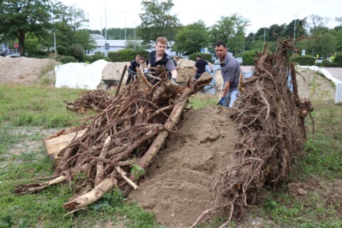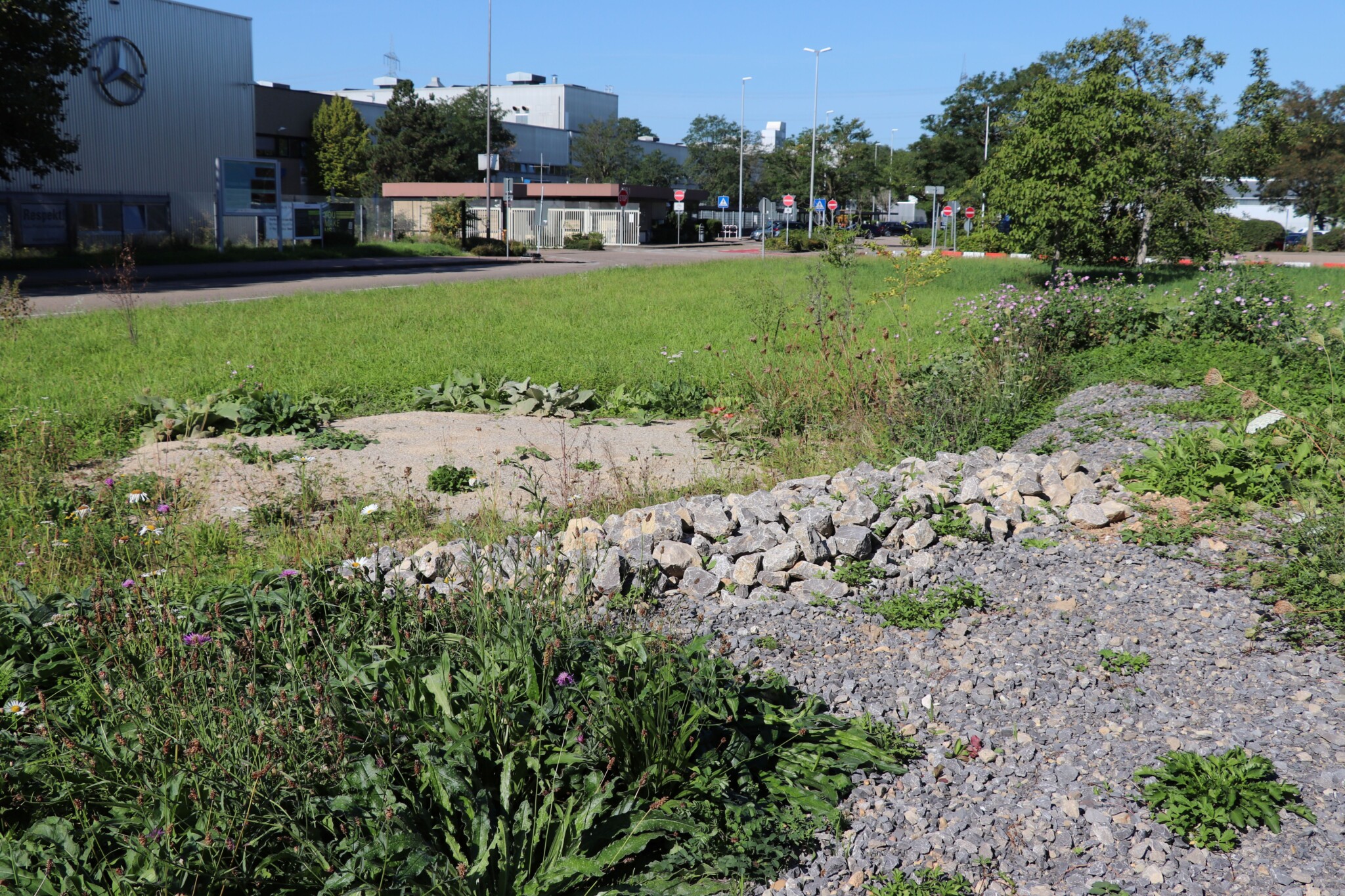 In drei Schritten wurden ca. 1400 m² der Rasenfläche entfernt und naturnah angelegt. Der Thymianrasen blieb unangetastet und 500 m² des Rasens rund um die Bäume blieb ebenfalls erhalten. Er wird jedoch nur noch 2 – 3 mal pro Jahr gemäht. Um unsere Projekte besser zu kommunizieren, teilen wir sie wenn notwendig bzw. möglich in Teilschritte auf, die jeweils einen Namen bekommen. Damit schaffen wir einen gewissen Wiedererkennungswert und fördern das Interesse – was steckt dahinter. Beim dargestellten Projekt wurde im ersten Schritt im Jahr 2023 auf ca. 500 m² eine Magerwiese geschaffen, die gestalterisch durch eine Hügellandschaft mit “Sandarium“ ergänzt wurde. Für den Hügel wurde das abgetragene Bodenmaterial der Rasenfläche verwendet und zusätzlich mit Schotter und Sand bedeckt. Der Hügel wurde teils mit Wildstauden bepflanzt, die Magerwiese stammt aus heimischem Saatgut. Im zweiten Schritt wurde Ende 2023/Anfang 2024 in direkter Nachbarschaft ein Vulkankegel errichtet, in dessen Zentrum ein kleiner, jedoch nicht dauerhaft gefüllter Teich mit Folie angelegt wurde. Aus dem Aushub entstand die Kraterwand mit einer Ausflussöffnung über die der mit Schotter belegte Teich sichtbar wird. Die umliegende Fläche wurde auf ca. 400 m² ebenfalls mager ausgebaut. Zwischen Krater und Baumreihe entlang der Straße wurde eine Gehölzsammlung als “Grüne Hölle“ gepflanzt. Hier wurde bereits Grünschnitt abgelagert, so dass er nicht extern entsorgt werden muss. Durch die Gehölze wird die “Grüne Hölle“ vom Rest der Magerwiese abgetrennt. Auch hier wurden heimische Stauden und heimische Saatgutmischungen verwendet. In einem dritten Schritt wurde im Jahr 2025 zwischen Vulkankegel und Thymianrasen auf ca. 500 m², nach dem Abtrag der umliegenden Grasnarbe, eine Käferburg als zentrales Element errichtet und die restliche Fläche mager ausgebaut. Die Käferburg besteht aus vielen Totholzelementen in unterschiedlicher Lage, im und über dem Boden eingebaut. Das ausgehobene Loch wurde mit Stroh und gehäckseltem Gehölzschnitt von anderen Grünflächen aufgefüllt. Zum Einsatz kam zusätzlich Schotter, Kies und Sand aus eigenen Baustellen (Bau von Gruben und Austrag von Bodenmaterial), die nicht extern entsorgt werden mussten. Als Abgrenzung zwischen Käferburg und Straße wurde mit zwei Wurzelstöcken von Robinien, die im Rahmen von Baumaßnahmen gefällt werden mussten, ein “Wurzelstockwall“ errichtet. Dieser besteht aus den besagten Wurzelstöcken, zwei größeren Stammteilen und weiteren Ästen, die mit Sand aus eigenen Baustellen angefüllt wurden und im Herbst bepflanzt werden. Grundsätzlich stammen sämtliche Materialien entweder vom Werksgelände bzw. aus dem näheren Umfeld, z.B. das Totholz teils von den zwei eigenen, gefällten Robinien bzw. Laubbäumen aus dem Rastatter Forst (angemodertes Holz aus dem Vorjahr, nach PEFC und FSC zertifiziert) und der Schotter/Sand der Bauabschnitte eins und zwei aus umliegenden Kiesgruben bzw. Steinbrüchen. Wie bei den beiden seit 1 – 2 Jahren blühenden ersten Teilflächen wurde auch bei der Käferburg auf heimisches Saatgut (Rieger-Hofmann Mischungen Blumenwiese, Schmetterlings- und Wildbienensaum, Sandmagerrasen und Verkehrsbegleitgrün) und heimische Wildstauden gesetzt. Die beiliegende NaturaDB Pflanzenliste umfasst alle drei beschriebenen Teilflächen.