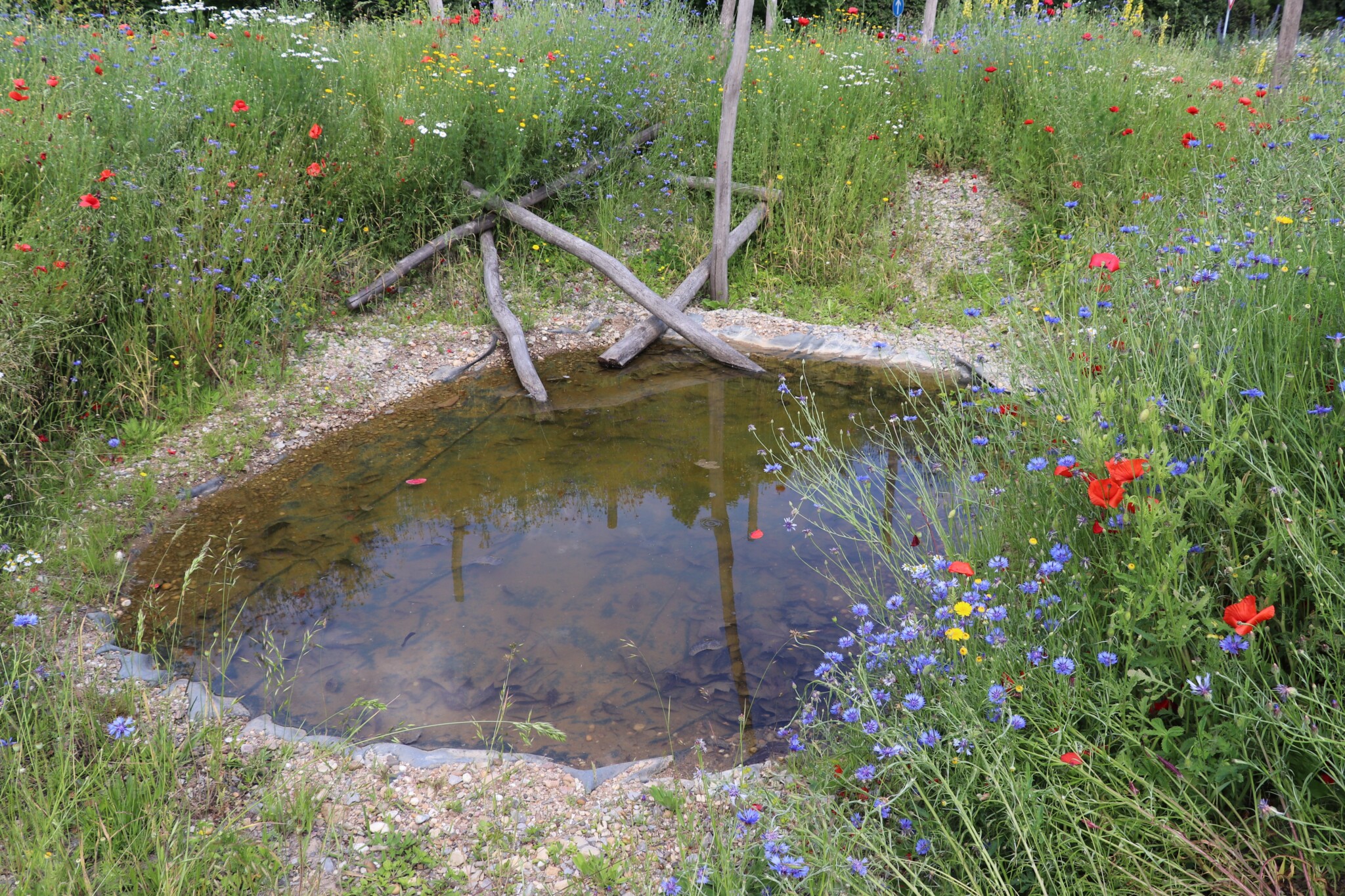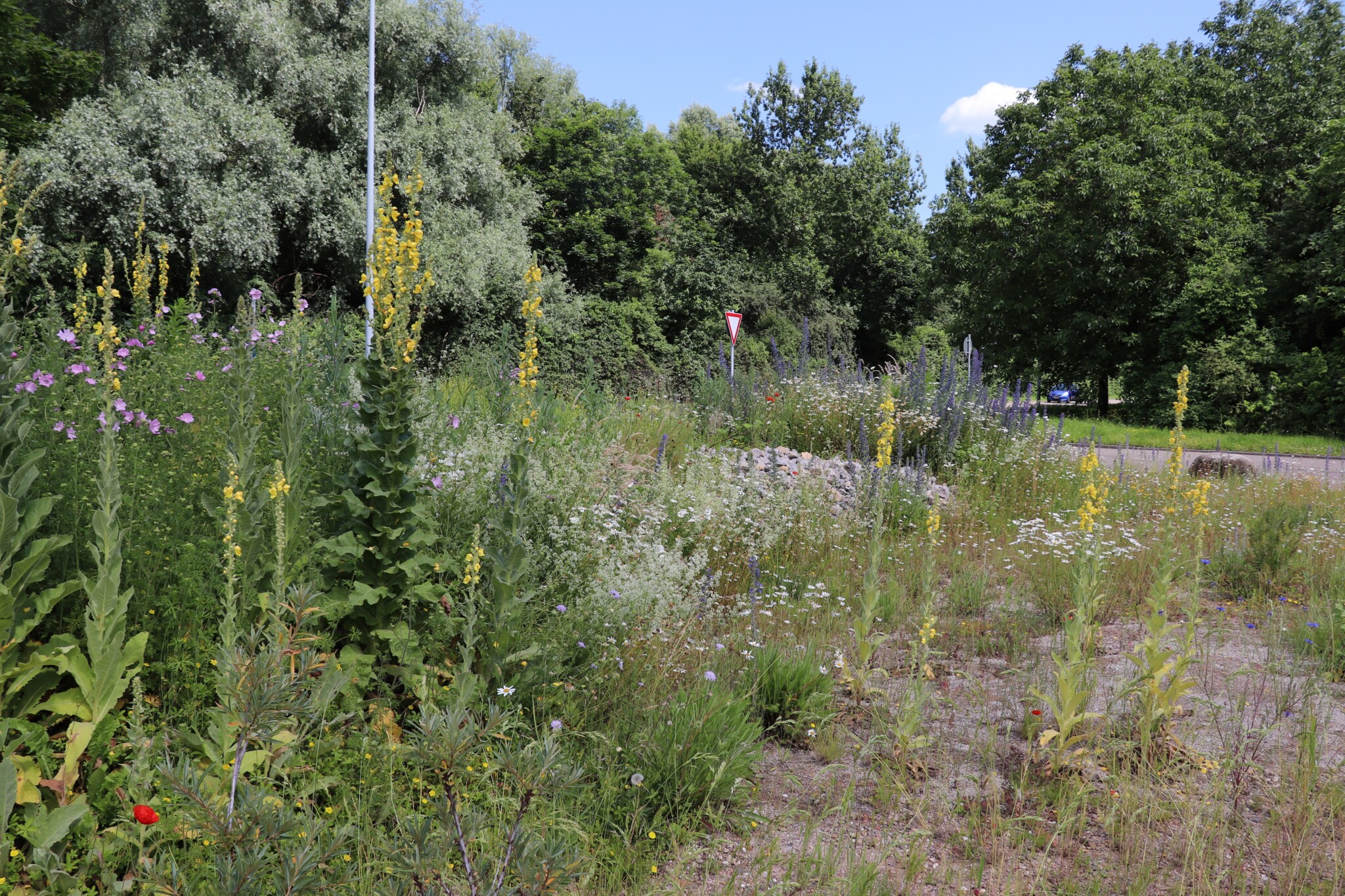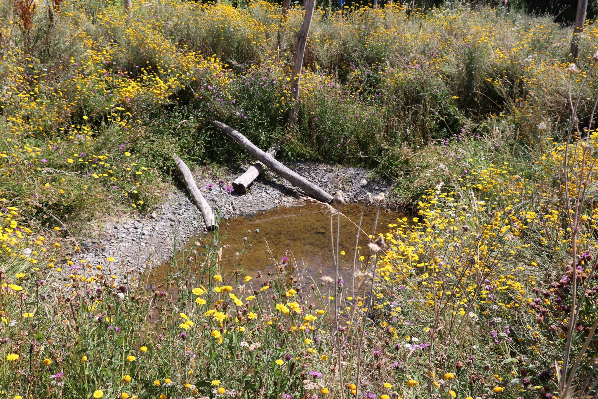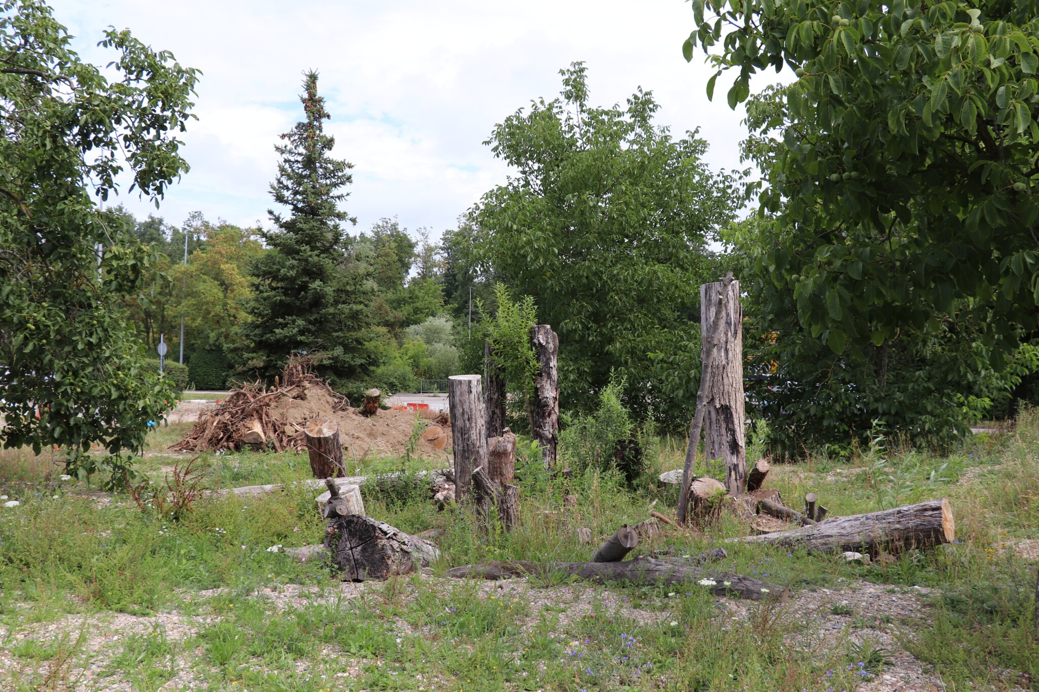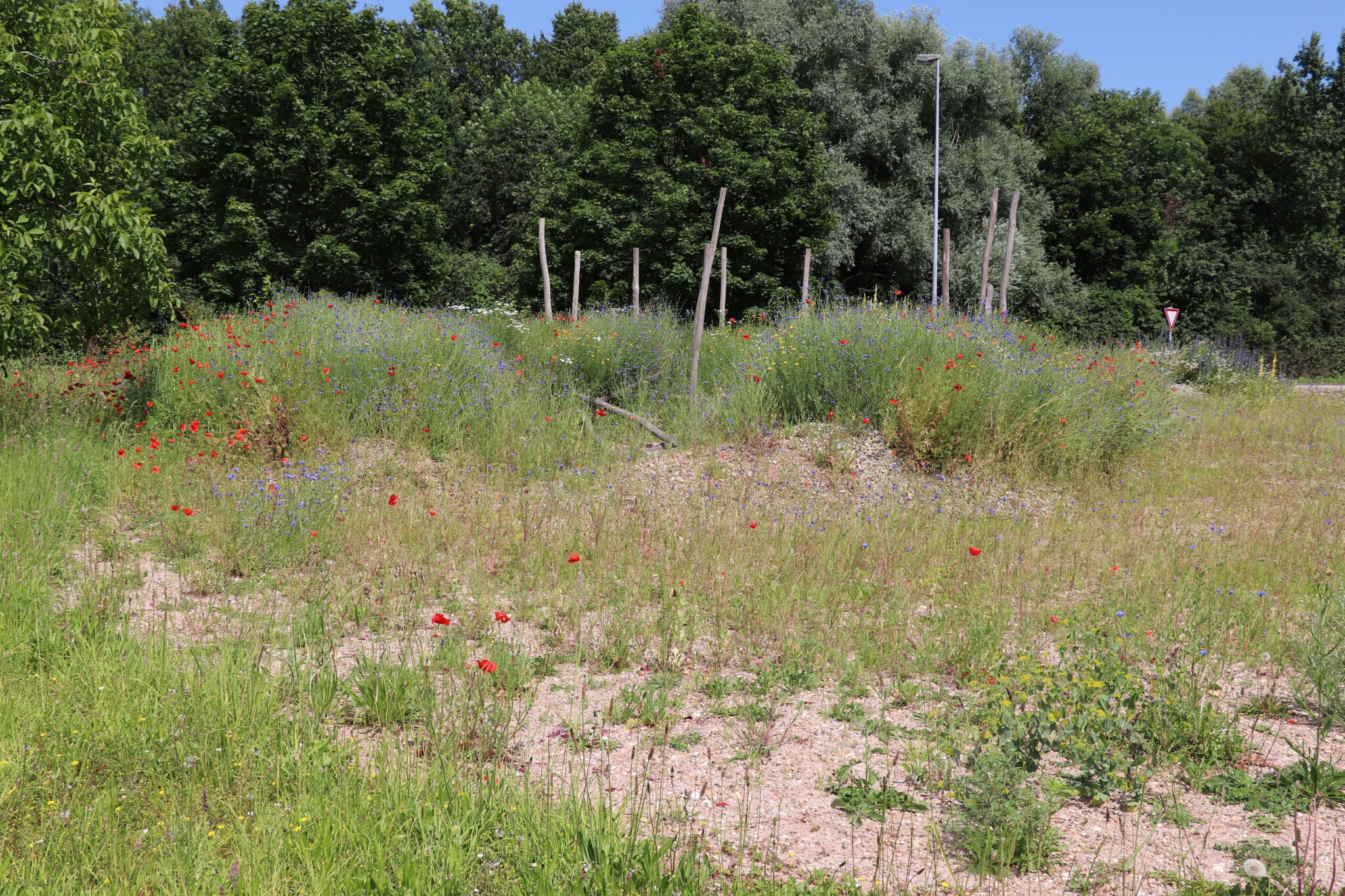 In drei Schritten wurden ca. 1400 m² der Rasenfläche entfernt und naturnah angelegt. Der Thymianrasen blieb unangetastet und 500 m² des Rasens rund um die Bäume blieb ebenfalls erhalten. Er wird jedoch nur noch 2 – 3 mal pro Jahr gemäht. Um unsere Projekte besser zu kommunizieren, teilen wir sie wenn notwendig bzw. möglich in Teilschritte auf, die jeweils einen Namen bekommen. Damit schaffen wir einen gewissen Wiedererkennungswert und fördern das Interesse – was steckt dahinter. Beim dargestellten Projekt wurde im ersten Schritt im Jahr 2023 auf ca. 500 m² eine Magerwiese geschaffen, die gestalterisch durch eine Hügellandschaft mit “Sandarium“ ergänzt wurde. Für den Hügel wurde das abgetragene Bodenmaterial der Rasenfläche verwendet und zusätzlich mit Schotter und Sand bedeckt. Der Hügel wurde teils mit Wildstauden bepflanzt, die Magerwiese stammt aus heimischem Saatgut. Im zweiten Schritt wurde Ende 2023/Anfang 2024 in direkter Nachbarschaft ein Vulkankegel errichtet, in dessen Zentrum ein kleiner, jedoch nicht dauerhaft gefüllter Teich mit Folie angelegt wurde. Aus dem Aushub entstand die Kraterwand mit einer Ausflussöffnung über die der mit Schotter belegte Teich sichtbar wird. Die umliegende Fläche wurde auf ca. 400 m² ebenfalls mager ausgebaut. Zwischen Krater und Baumreihe entlang der Straße wurde eine Gehölzsammlung als “Grüne Hölle“ gepflanzt. Hier wurde bereits Grünschnitt abgelagert, so dass er nicht extern entsorgt werden muss. Durch die Gehölze wird die “Grüne Hölle“ vom Rest der Magerwiese abgetrennt. Auch hier wurden heimische Stauden und heimische Saatgutmischungen verwendet. In einem dritten Schritt wurde im Jahr 2025 zwischen Vulkankegel und Thymianrasen auf ca. 500 m², nach dem Abtrag der umliegenden Grasnarbe, eine Käferburg als zentrales Element errichtet und die restliche Fläche mager ausgebaut. Die Käferburg besteht aus vielen Totholzelementen in unterschiedlicher Lage, im und über dem Boden eingebaut. Das ausgehobene Loch wurde mit Stroh und gehäckseltem Gehölzschnitt von anderen Grünflächen aufgefüllt. Zum Einsatz kam zusätzlich Schotter, Kies und Sand aus eigenen Baustellen (Bau von Gruben und Austrag von Bodenmaterial), die nicht extern entsorgt werden mussten. Als Abgrenzung zwischen Käferburg und Straße wurde mit zwei Wurzelstöcken von Robinien, die im Rahmen von Baumaßnahmen gefällt werden mussten, ein “Wurzelstockwall“ errichtet. Dieser besteht aus den besagten Wurzelstöcken, zwei größeren Stammteilen und weiteren Ästen, die mit Sand aus eigenen Baustellen angefüllt wurden und im Herbst bepflanzt werden. Grundsätzlich stammen sämtliche Materialien entweder vom Werksgelände bzw. aus dem näheren Umfeld, z.B. das Totholz teils von den zwei eigenen, gefällten Robinien bzw. Laubbäumen aus dem Rastatter Forst (angemodertes Holz aus dem Vorjahr, nach PEFC und FSC zertifiziert) und der Schotter/Sand der Bauabschnitte eins und zwei aus umliegenden Kiesgruben bzw. Steinbrüchen. Wie bei den beiden seit 1 – 2 Jahren blühenden ersten Teilflächen wurde auch bei der Käferburg auf heimisches Saatgut (Rieger-Hofmann Mischungen Blumenwiese, Schmetterlings- und Wildbienensaum, Sandmagerrasen und Verkehrsbegleitgrün) und heimische Wildstauden gesetzt. Die beiliegende NaturaDB Pflanzenliste umfasst alle drei beschriebenen Teilflächen.
